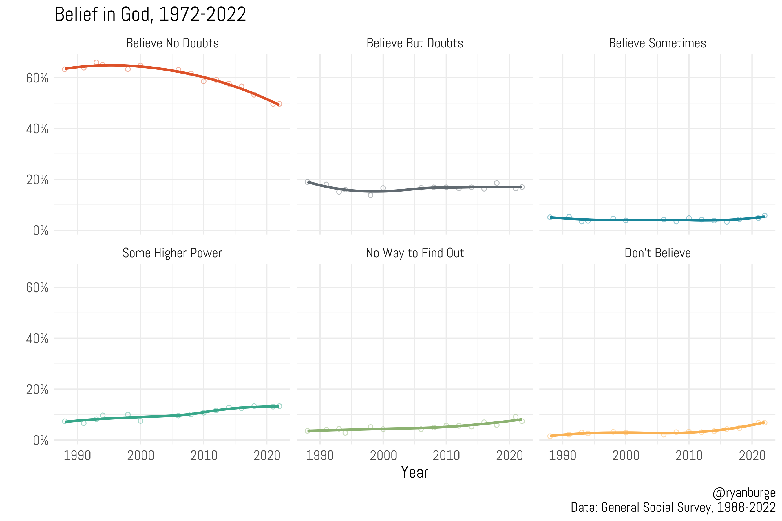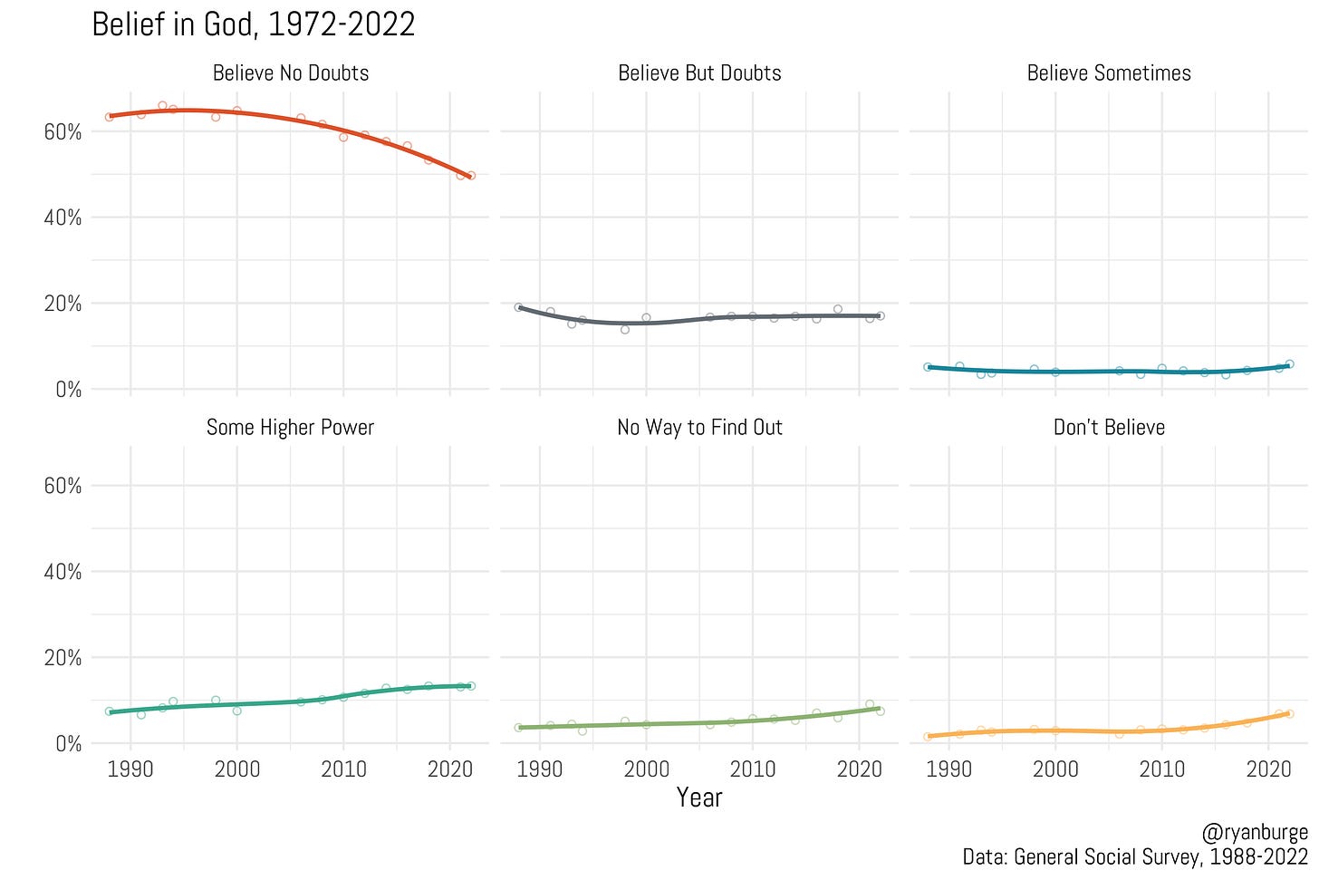 Notice anything? A general sense of stability is what first jumps out to me. Most of the lines are just flat over time. The “believe but doubts” and “believe sometimes” share is not statistically different in 1988 compared to 2022.