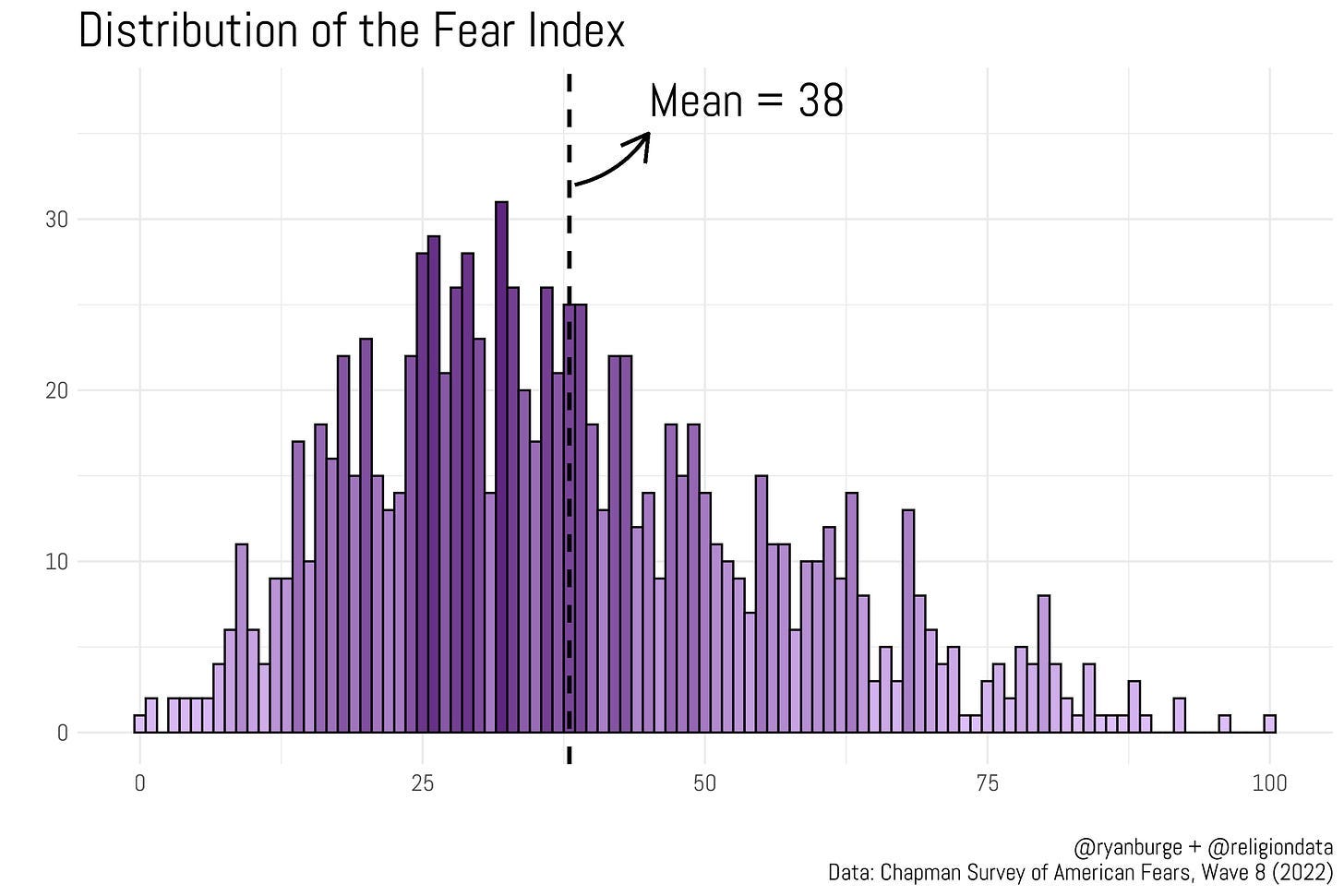 But to help us understand a central metric of fears, I created an additive index of all 72 items. Being very afraid was scored as a 4 and being not at all afraid was scored a 1. I combined all those items together and then normalized the range of values so that 0 was the ‘least afraid’ person in the dataset. While 100 meant that person was afraid of the most things. Here’s a visualization of how those scores were distributed throughout the sample.