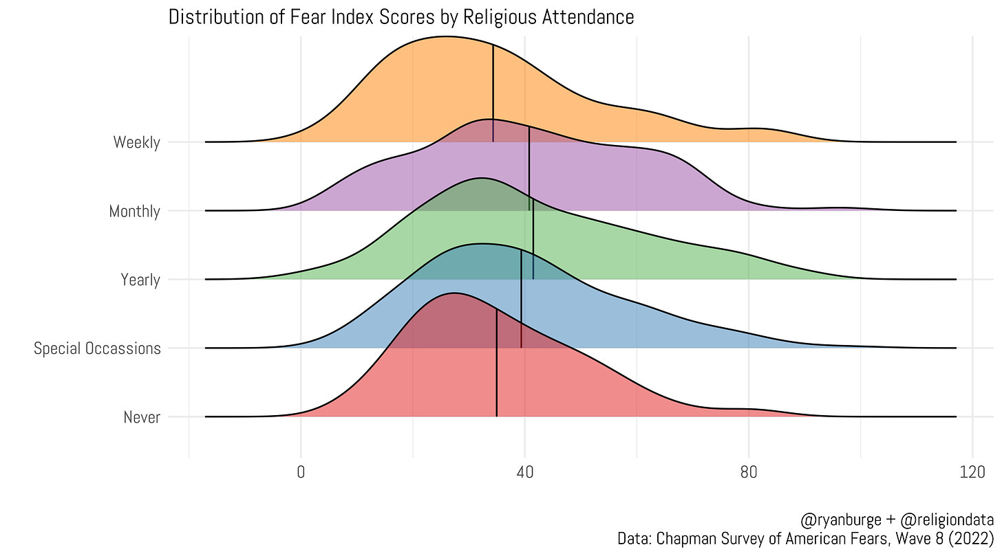 As you can see, there’s a curvilinear relationship between church attendance and fear. The people that score the lowest on this metric are those who never attend religious services and those who are weekly attenders (compare their respective vertical black lines). Their mean score was 37 and 35, respectively. The attendance level in which fear is the highest are those who are yearly attenders - they scored a 44. This result comports with the previous finding about religious importance. The people at either end of the spectrum score the lowest and those in the middle score the highest.