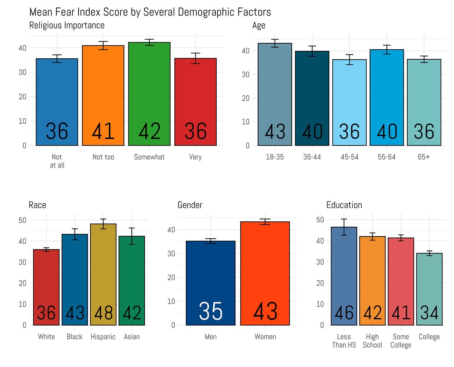 But before I start digging deeply into the relationship between religion and fear, I wanted to help orient us to how fear is distributed in the public on a number of demographic variables like age, race, and education. That’s what I did below.