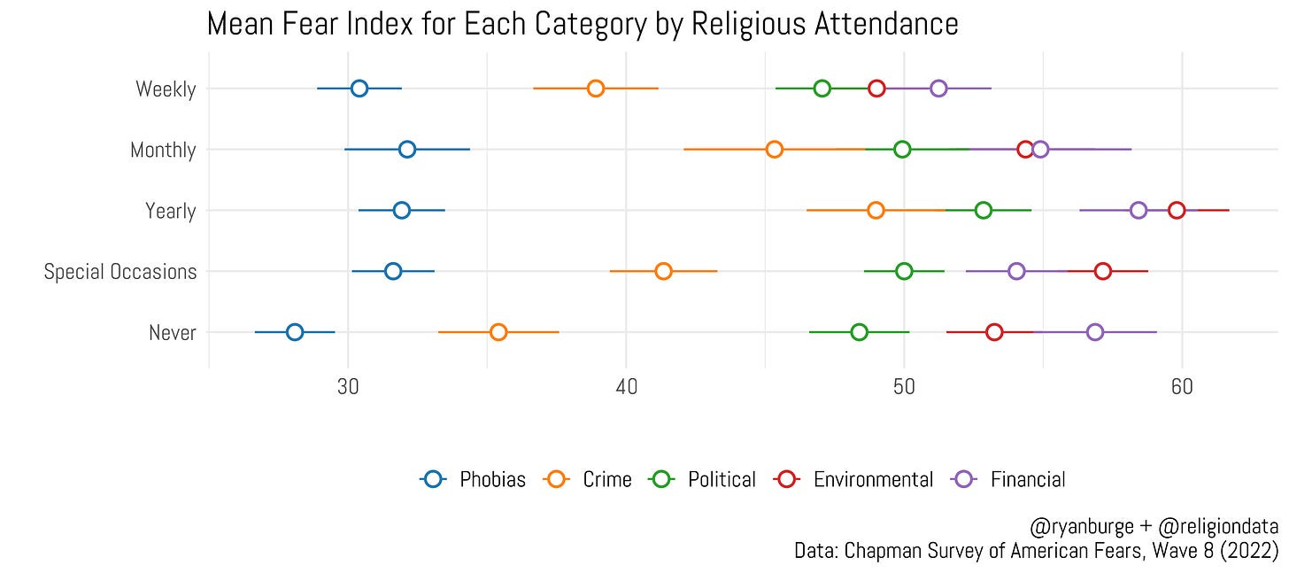 It’s hard to look at this analysis and have a really clear conclusion about the relationship between religion and fear. Never attenders and weekly attenders look very similar on a lot of these metrics. It’s the occasional attenders that express higher levels of fear on these topics. Maybe a little bit of interaction with others in religious settings, but not too much, is the right recipe to generate increased fear levels. I feel like that’s a finding that should warrant some future investigation.