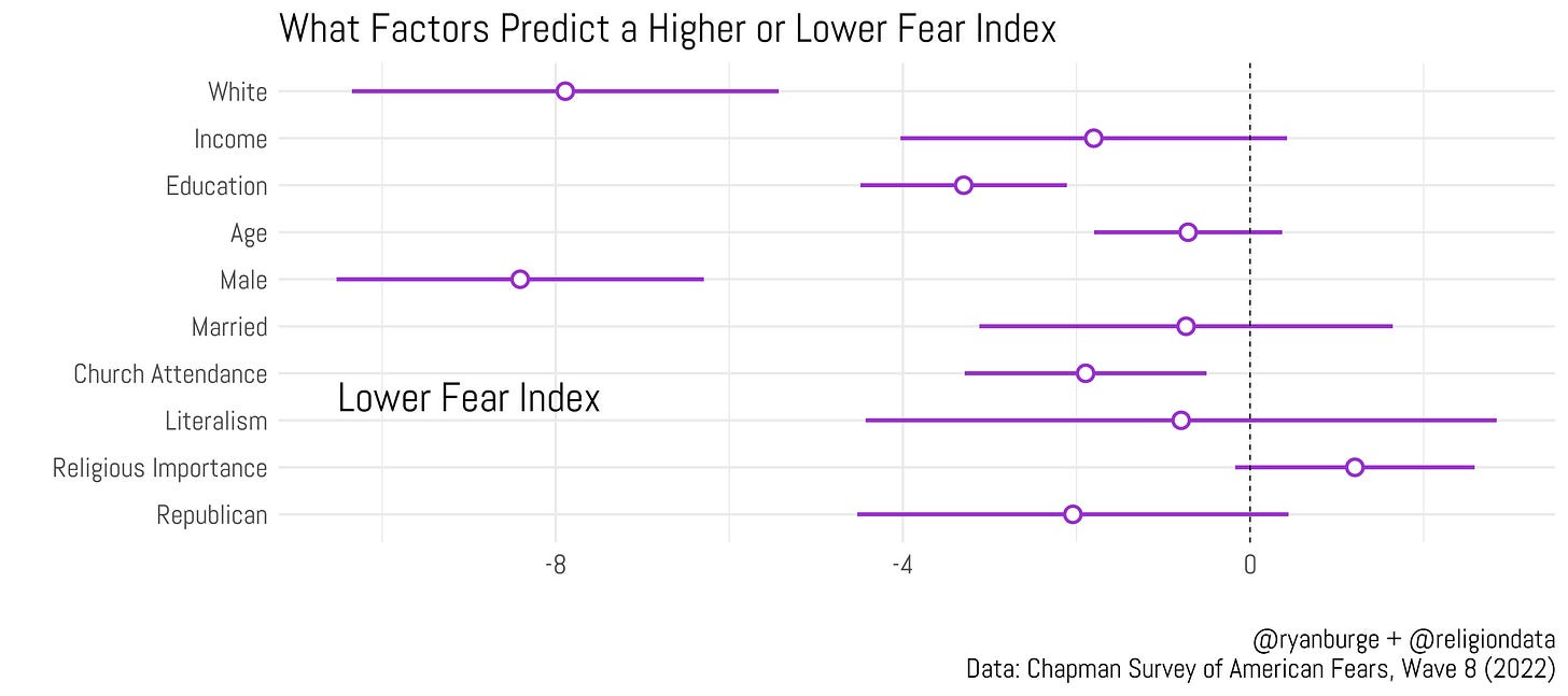That got me wondering if I could determine what types of factors lead people to having a higher or lower fear index. So, I threw a bunch of variables into a regression where the dependent variable was the fear index that ran from 0 to 100. I also included a handful of religious questions and a measure of political partisanship. If the purple lines overlap with zero, that variable was not statistically significant.