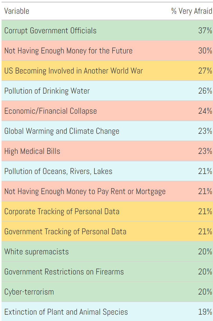 The clear winner here is not one I would have expected - corrupt government officials. About 37% of folks said that they were very afraid and another 26% said that they were afraid. Then, there was a mix of a whole bunch of categories like financial worries (30% of people were afraid that they would run out of money). World war was a significant concern, as was pollution of drinking water. I tried to color code them by general category of concern (environmental, government, financial, etc.) and it’s impressive how much variety there was at the top of the list.