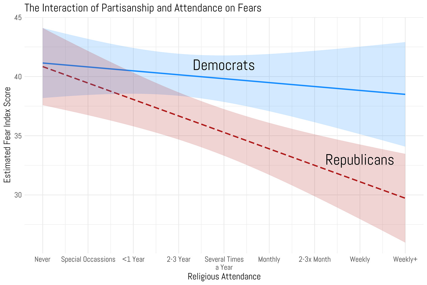But I wanted to leave you with one more regression analysis. This time I interacted two variables–religious attendance and political partisanship–to see if politics is really that important when it comes to expressed fears.