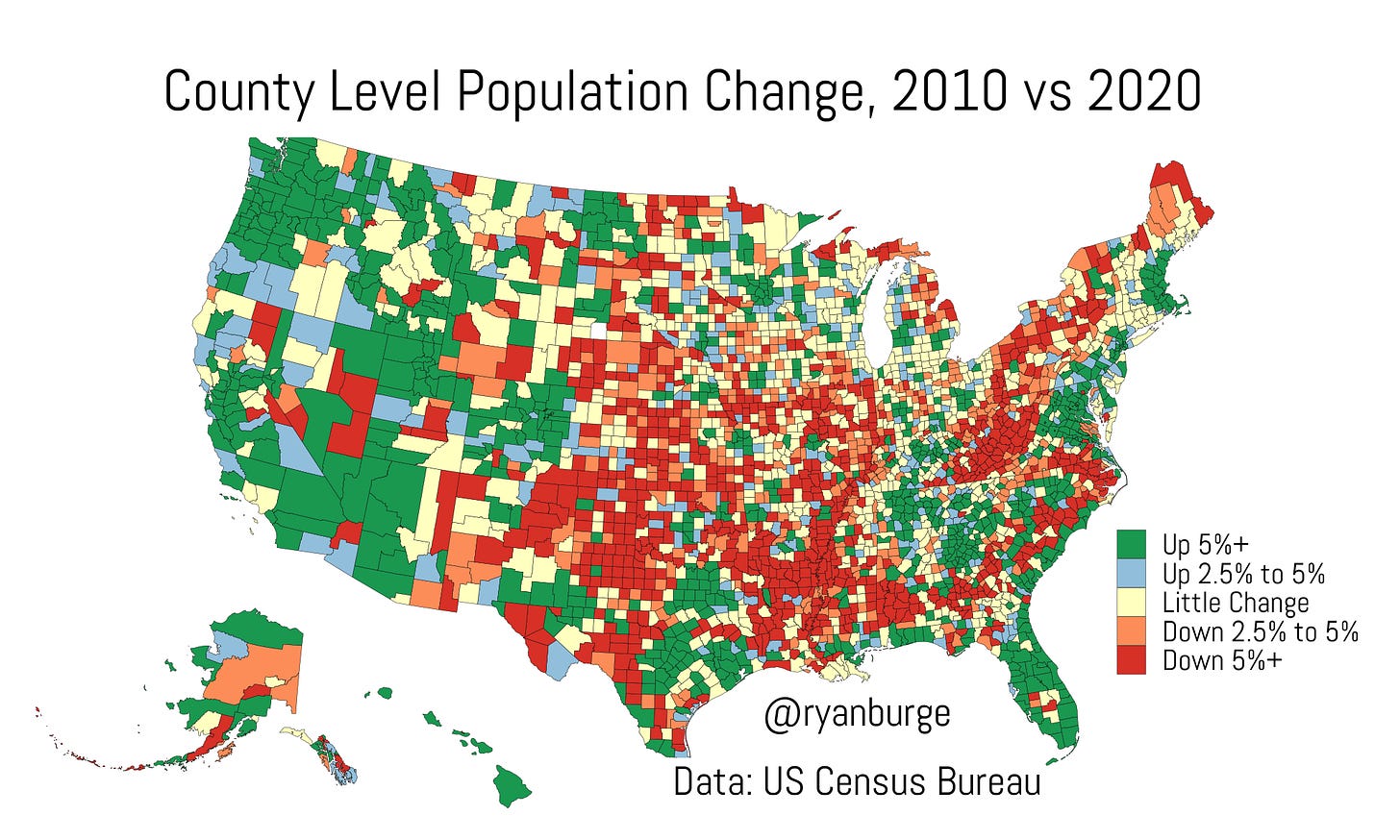 But the dark red is pretty easy to see, right? It’s all over the Texas panhandle and up into Oklahoma and through Kansas. The Mississippi River is also flanked by counties in decline, which is especially prominent in the South. But you can also see a huge blob of red in West Virginia and the western part of Virginia, and all through upstate New York.