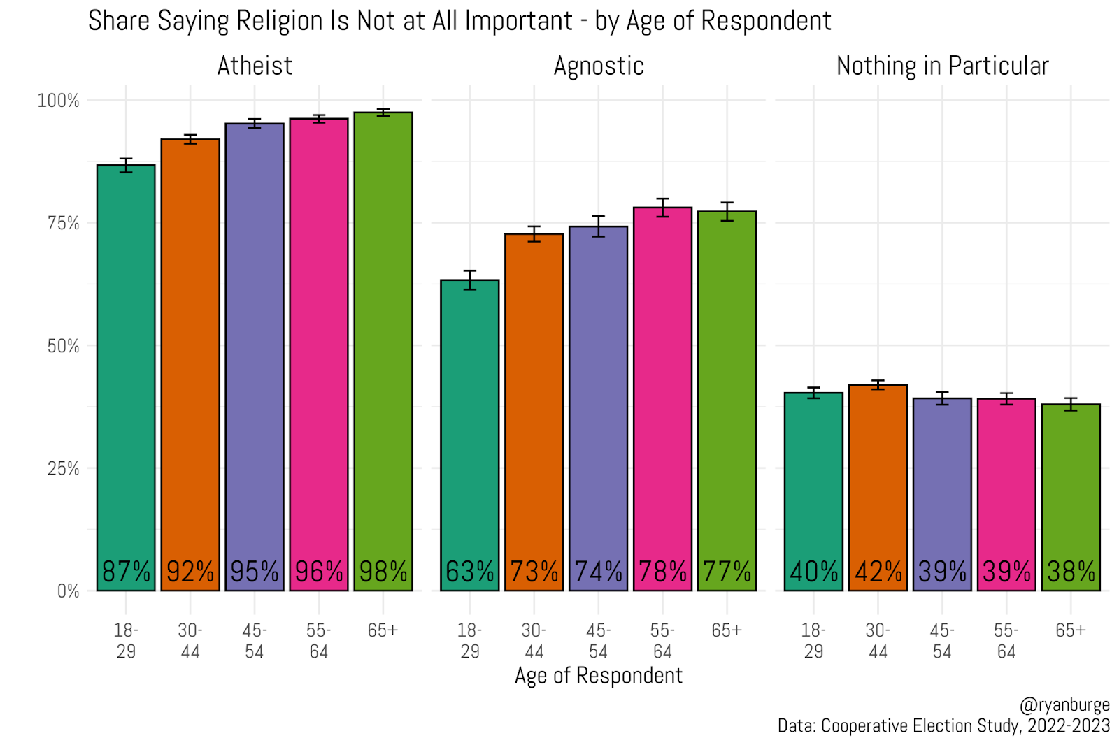 Well, let me try and back into an answer to that question a bit today. Let me just show you a graph that I made that I was thinking about a lot over the holidays - it’s the response to a simple question about religious importance. But I broke it down into the three types of non-religious folks: atheists, agnostics, and those who claim no religion in particular. It’s a phrase that I feel like have typed a thousand times in my life but - all nones are not created equal. There are huge differences on just this single question.