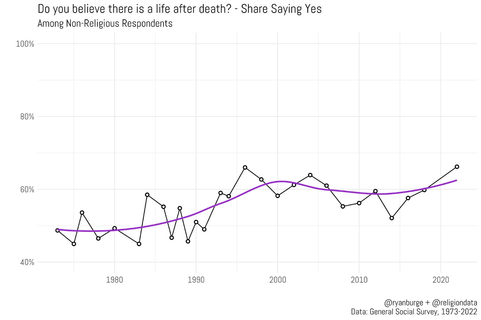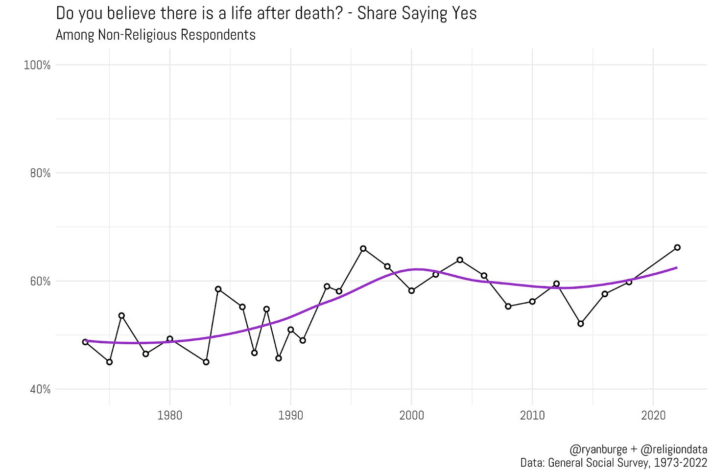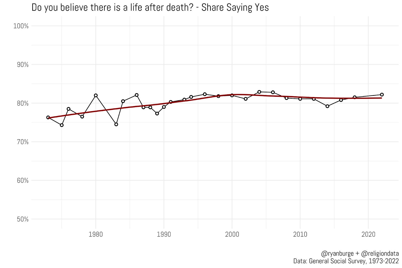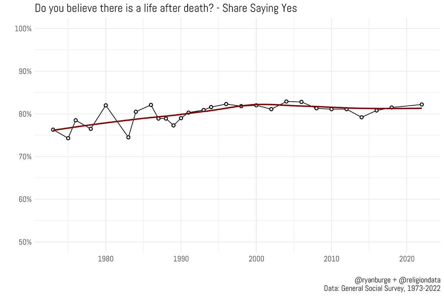 I wanted to dig a bit deeper on the variations in those belief metrics today, with a question that I haven’t really probed a whole lot. The General Social Survey, which is available on the Association of Religion Data Archives website, contains a really straightforward question, “Do you believe there is a life after death?” And it has an even simpler set of response options - yes or no. It’s been asked with regularity since 1973, so we have nearly five decades of data on this one specific question.