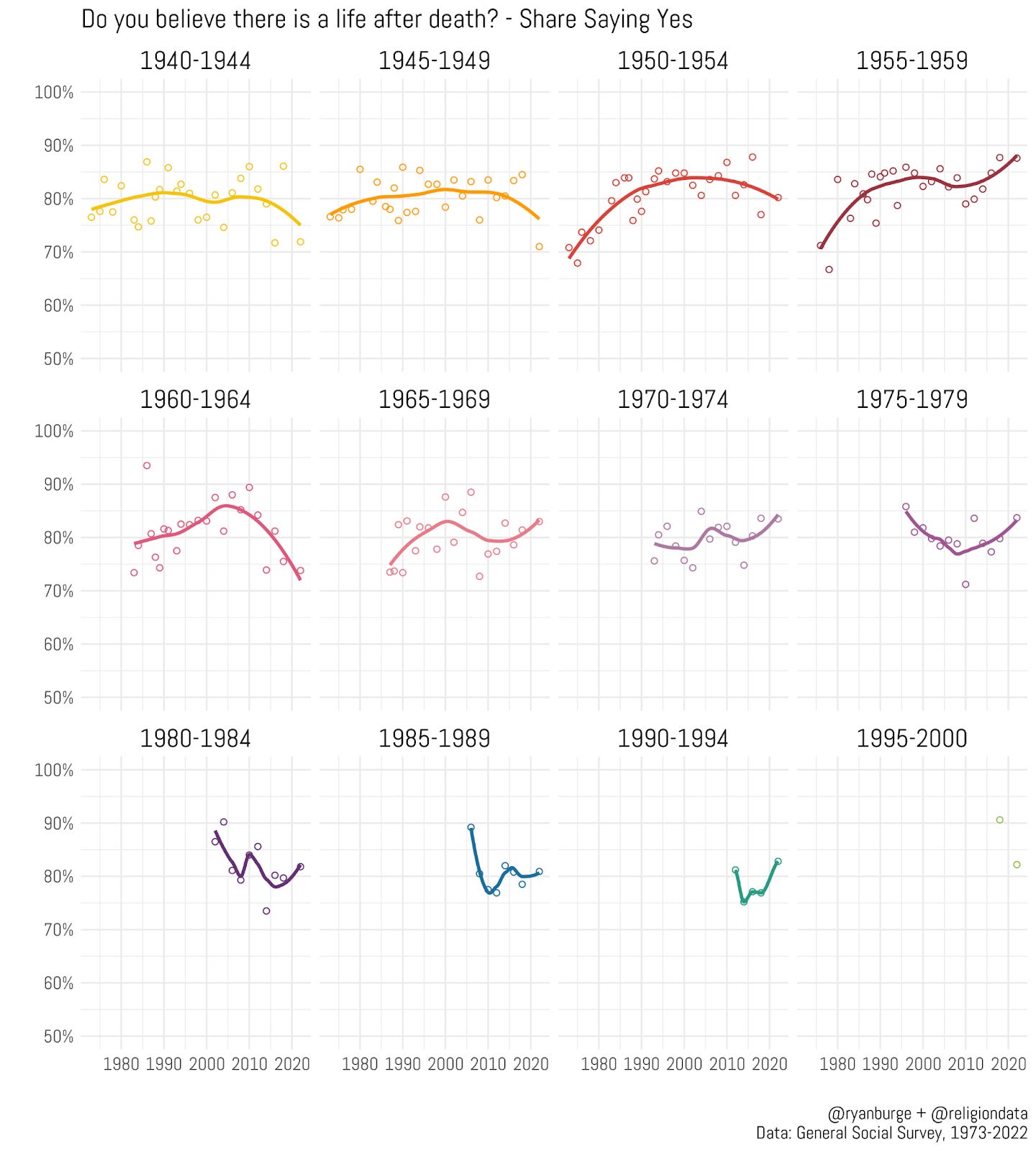I don’t know what to make of the second row, really. A pretty noticeable dip among those born in the 1960s certainly stands out to me, but then the next three cohorts haven’t really reported a consistent trajectory. For each of those groups, belief in life after death is about in the same spot - 83%. How about the younger adults? Again, I don’t really see a clear movement in either direction. What I also want to point out is that people born in the 1980s are just as likely to believe in life after death as people thirty or forty years earlier.