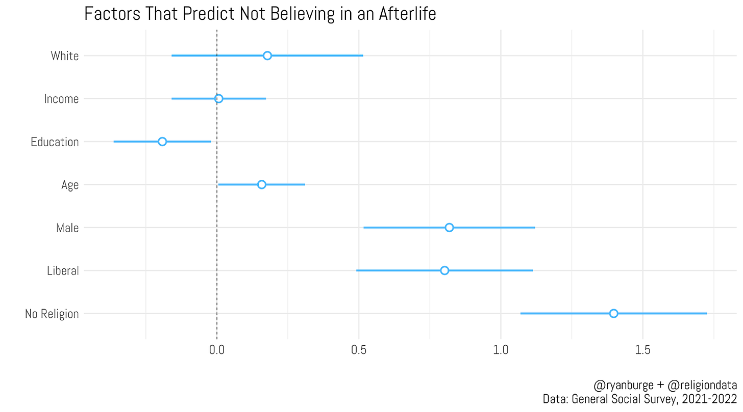 How about we cap this off by trying to predict what factors may lead to someone rejecting the idea of an afterlife? This is a simple logit regression and I threw in a handful of possibly relevant variables. Positive coefficients are factors that lead to a person being more likely to say that there is no afterlife.