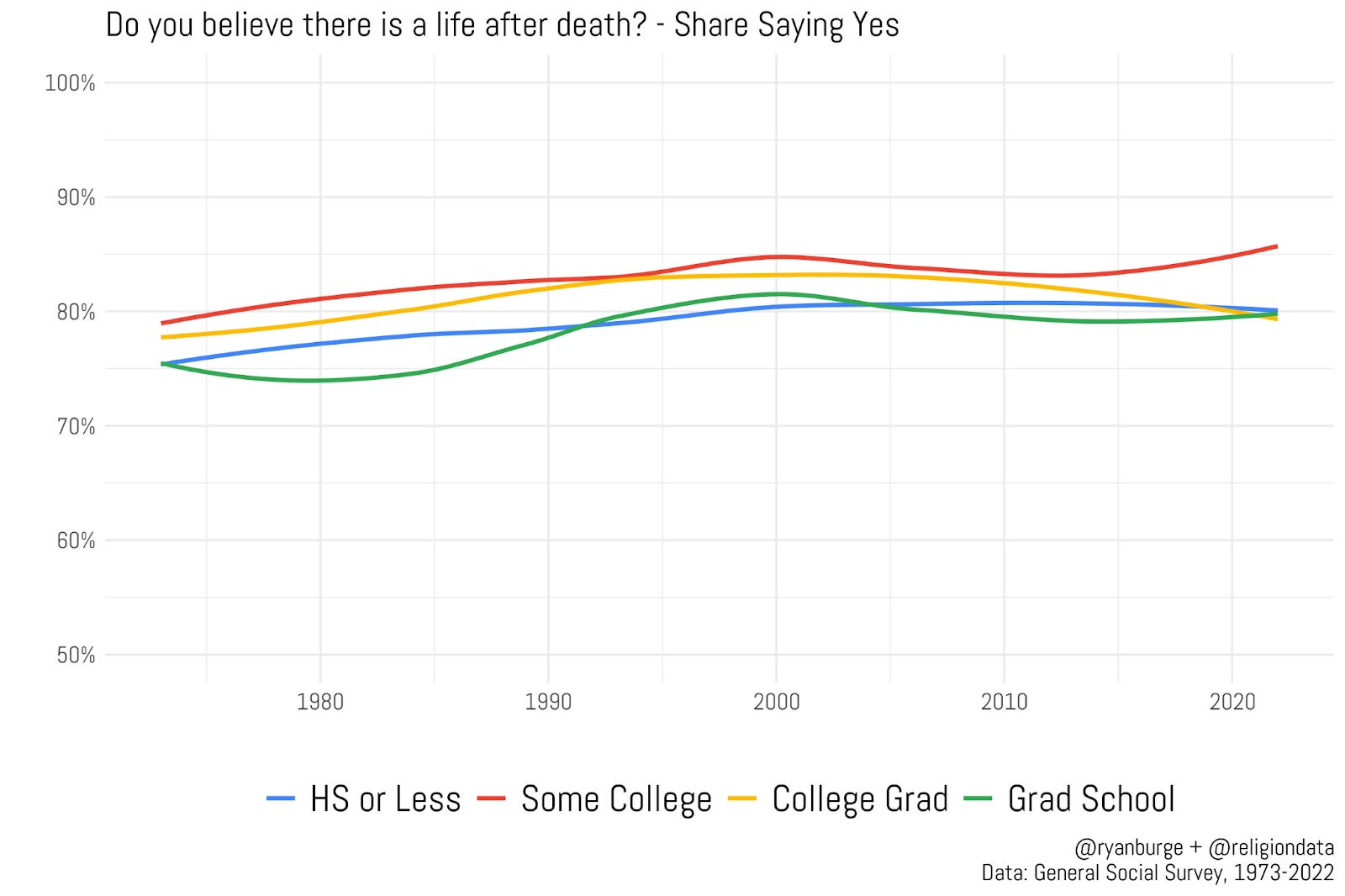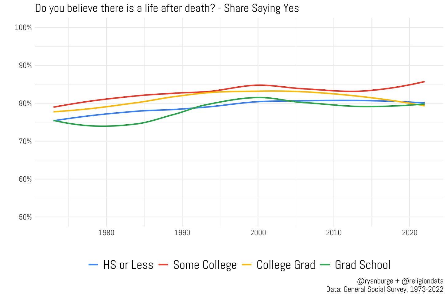 That five point difference is basically there for the entire run of the time series. One line never really deviates that much from the rest of them. I also don’t think it’s really possible to say that having more education makes one more (or less) likely to believe in life after death. In the most recent survey from 2022, 80% of those with no more than a high school education believed in an afterlife. It was 79% of those with a four year degree and 81% of people who had gone beyond a bachelors. In other words - there is no statistically significant impact of education on belief in life after death.