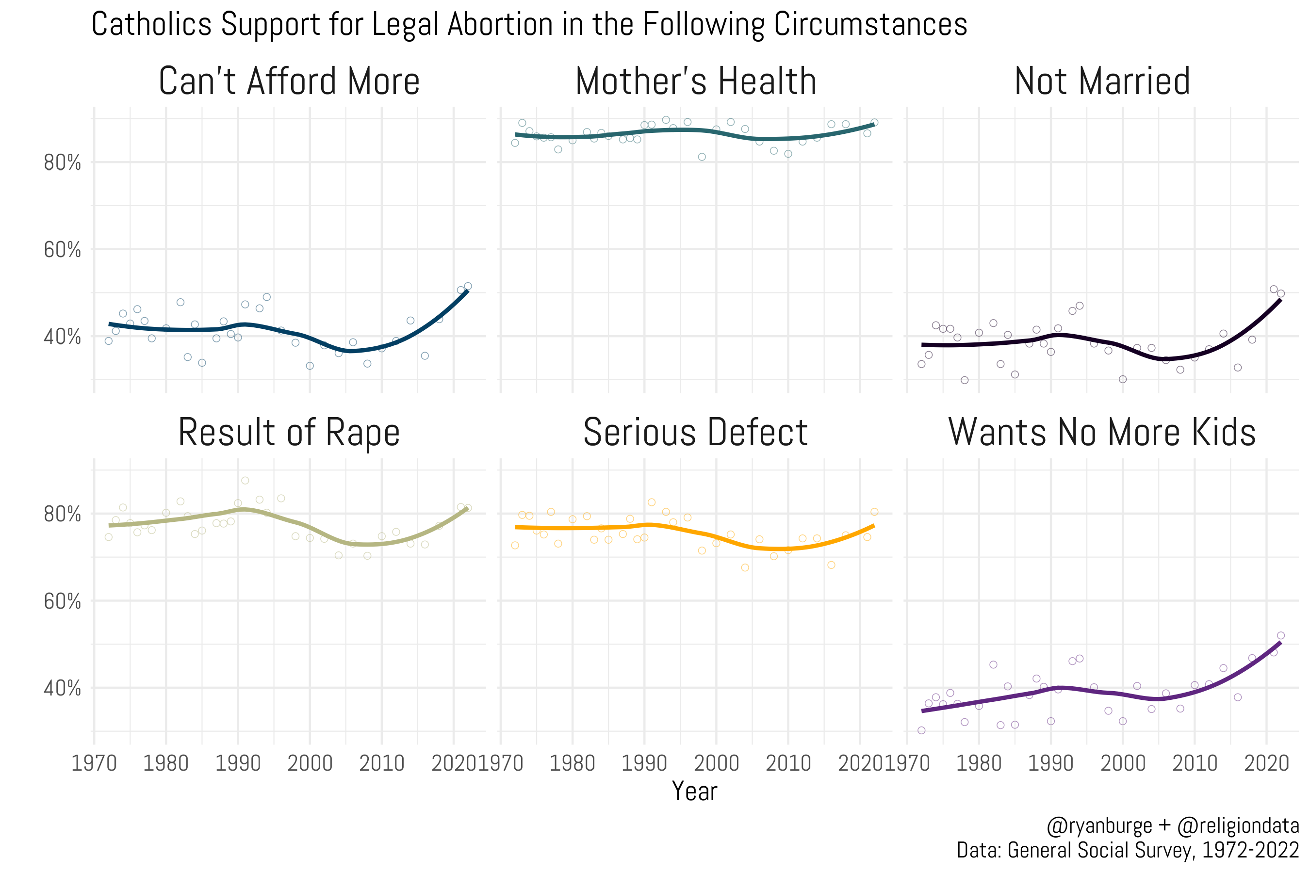 The GSS has been asking questions about abortion if the woman wants no more children for decades. From the 1970s through the 1990s, the share of Catholics who would allow an abortion in that circumstance was right around 40%. That share dipped just a little bit through the 2000s but has significantly increased in the last decade or so. Now, about half of Catholics would support an abortion in that circumstance. The trend line is largely the same when Catholics are asked about electing an abortion in the situation where the woman is not married. Now, about half of Catholics would support the right of a woman to obtain a legal abortion in that case.