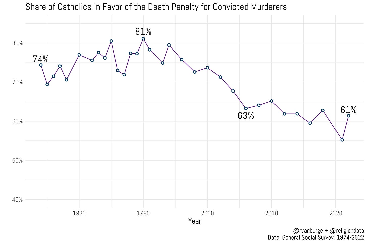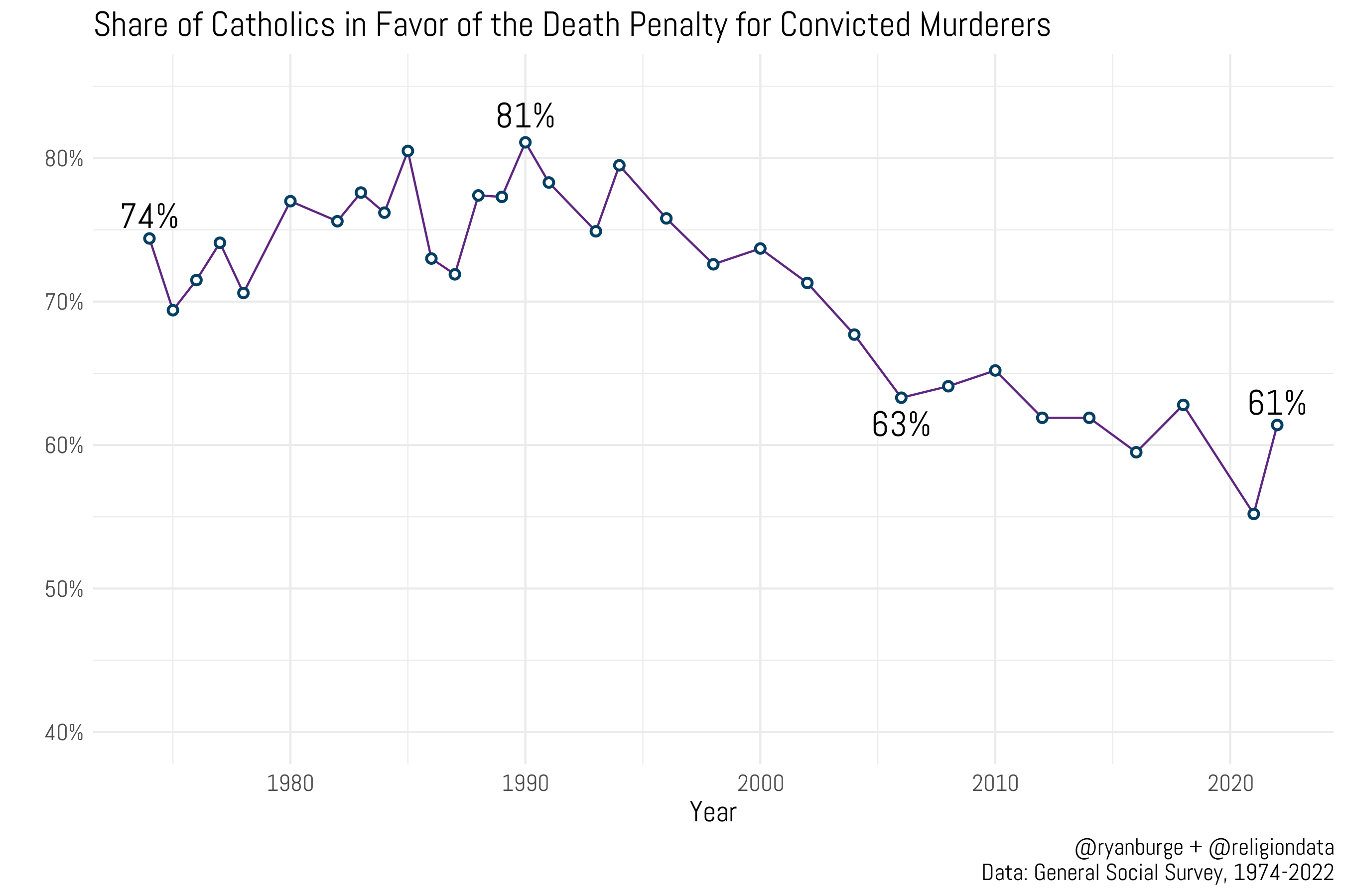 In the last few years, there’s some evidence that capital punishment has become less palatable to Catholics. In fact, in the survey collected in 2021, just 55% were in favor. However, that numbered rebounded just a bit in 2022 to 61%. But there has not been a time in the last 45 years in which a majority of Catholics have affirmed the teachings of their faith on the issue of capital punishment.