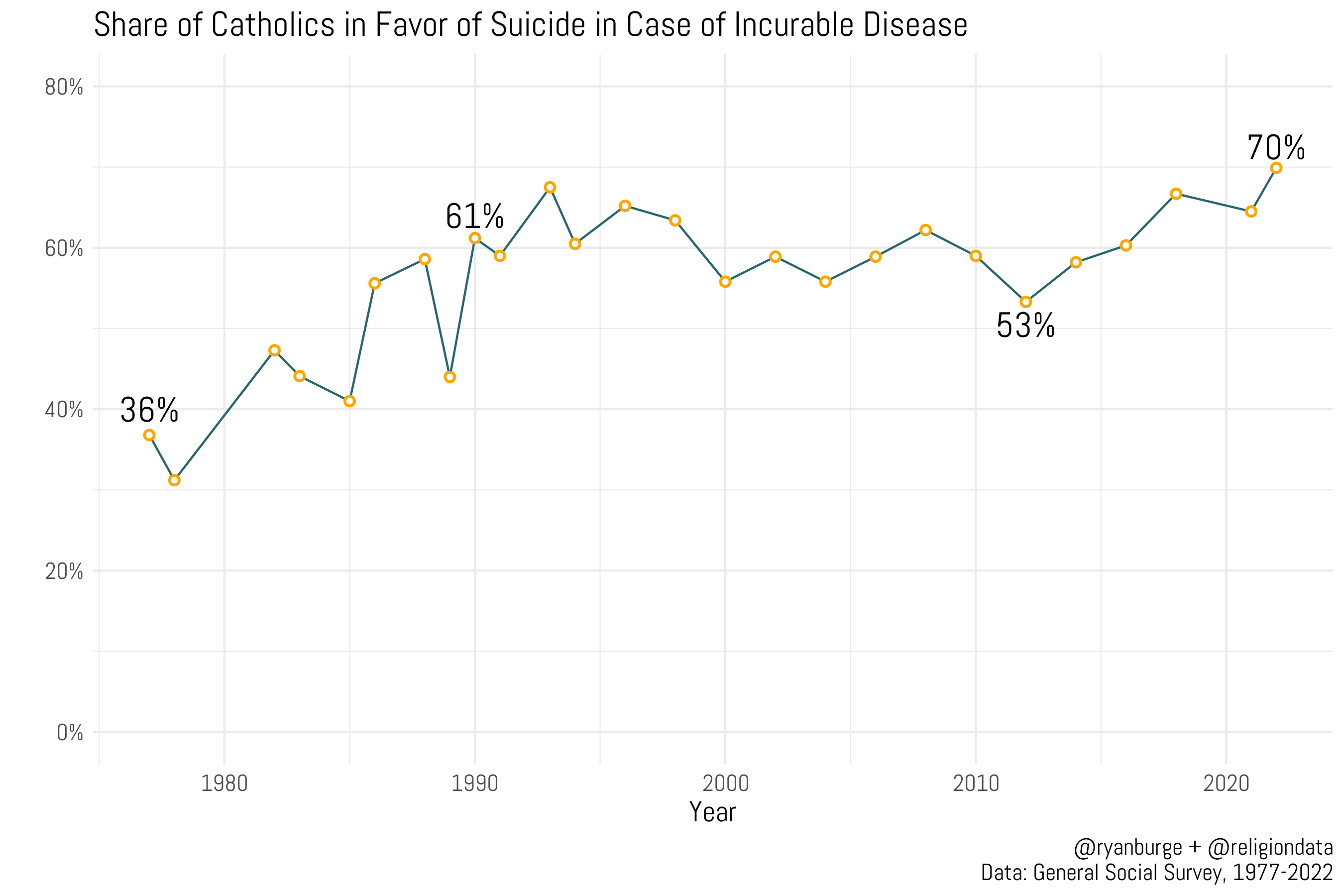 While there was a decline in support between 2008 and 2012, there was another surge in support in the most recent data. By 2022, about 70% of Catholics were in favor of euthanasia. That was basically double the share who supported the practice in 1977.