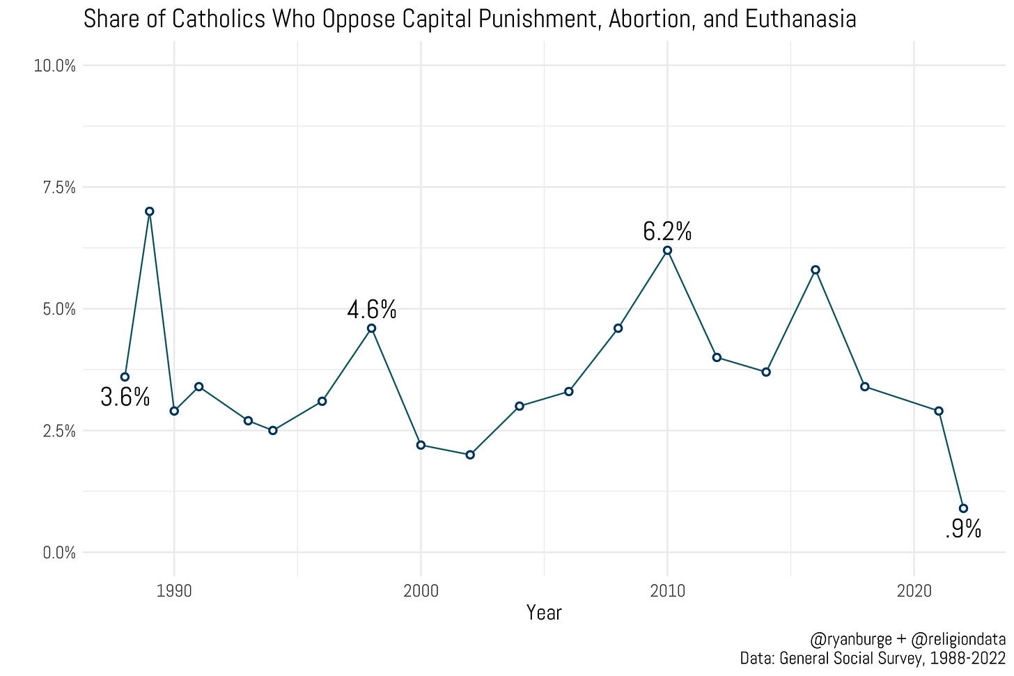 To simplify this analysis, I calculated the share of Catholics who did not support abortion for any reason, those who opposed capital punishment and also opposed euthanasia in the previously described scenario. Here’s the end result.