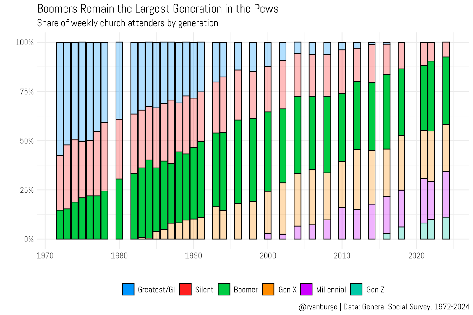 A couple of months ago, I wrote a post I knew would cause a stir — and it did. I try to avoid clickbait titles, but sometimes you just have to be blunt: When Are Half Your Members Going to be Dead? The argument was simple: Baby Boomers are propping up many of the most prominent denominations in the United States. That’s manageable for now — the oldest Boomers just turned 80, and most are still living active, socially engaged lives.