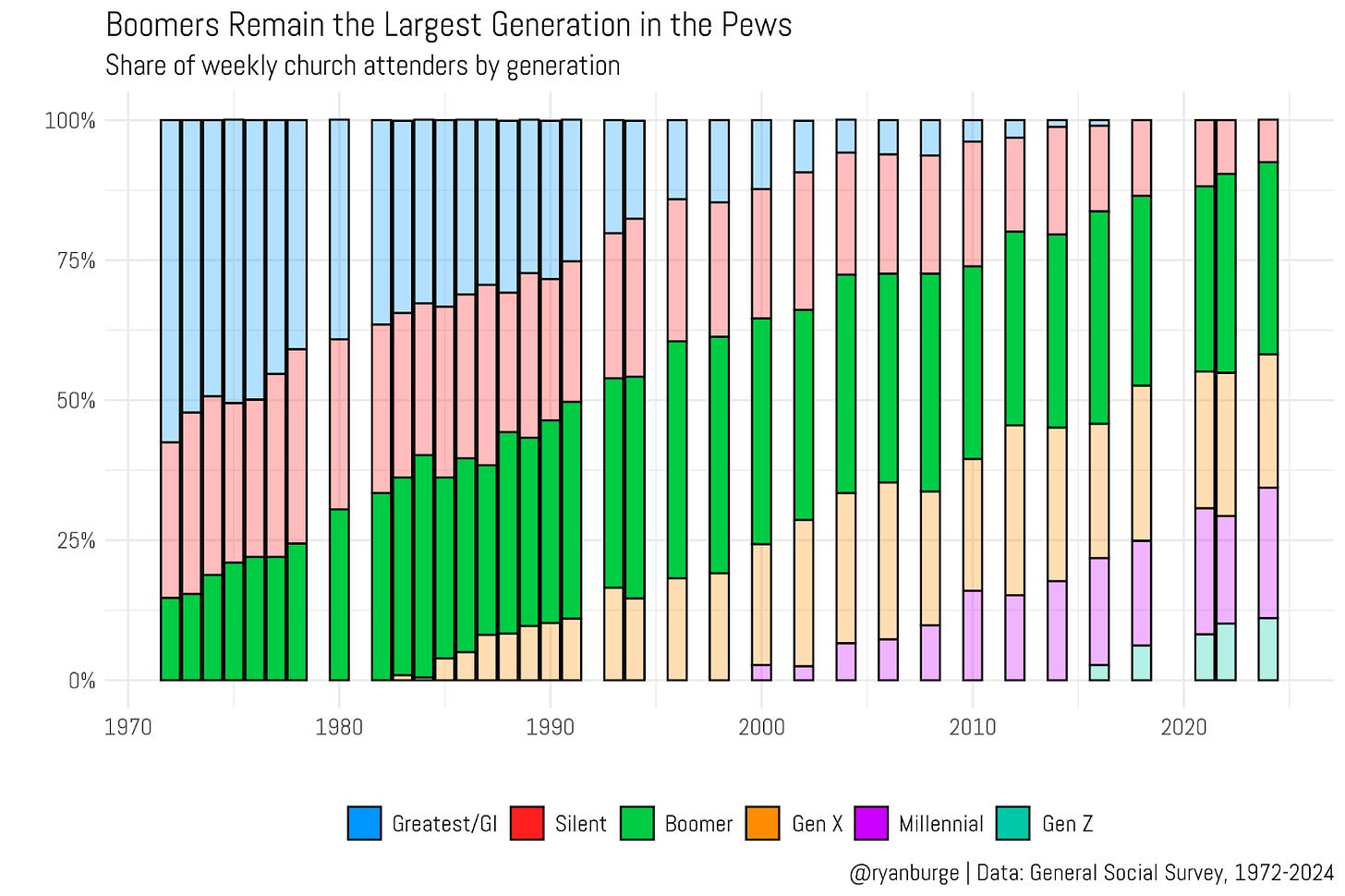 Those green bars just keep showing up. Baby Boomers have dominated churchgoing in this country for the vast majority of the last fifty years. That might seem counterintuitive — didn’t a lot of Boomers walk away from faith when they were young? Shouldn’t they be out driving RVs or sipping frozen drinks on a beach somewhere? The data says otherwise, I will get to that in a minute.