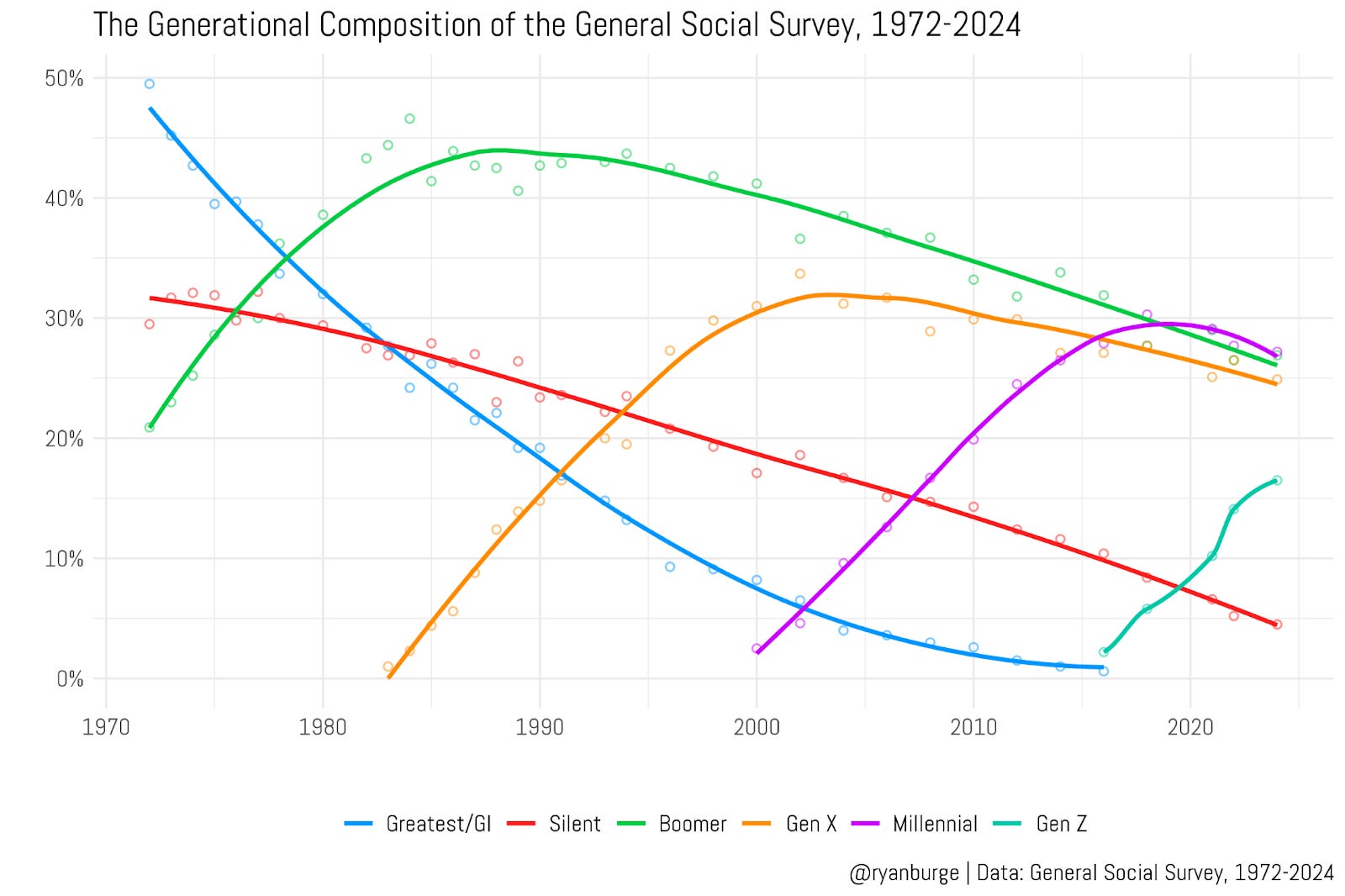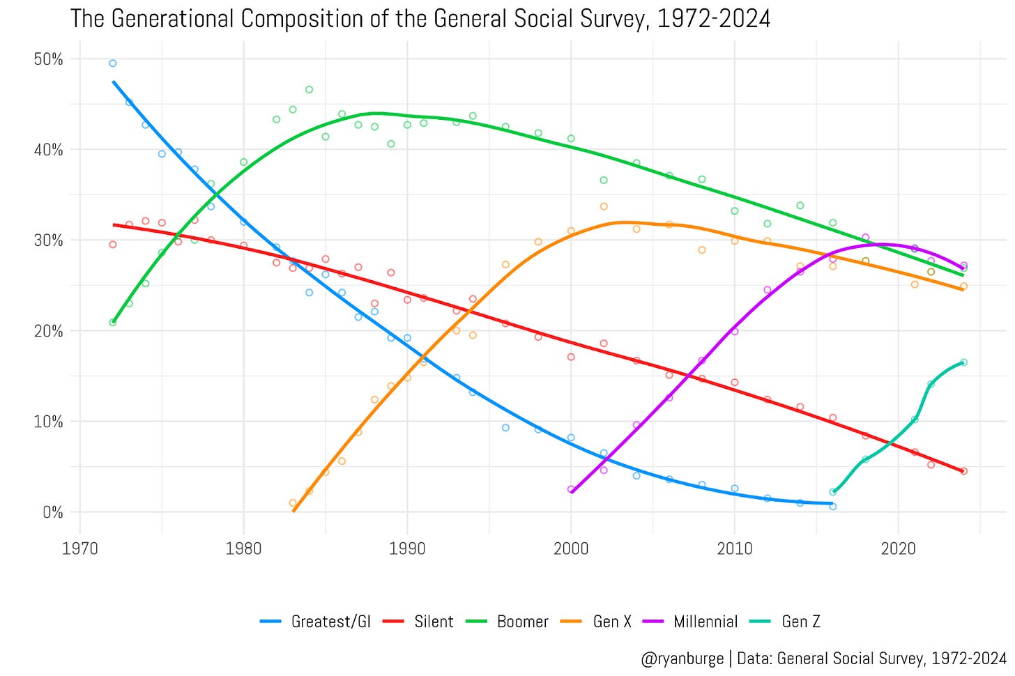 Between 1980 and roughly 2022, Boomers were the largest generation in the GSS. They’ve only recently been eclipsed by Millennials.