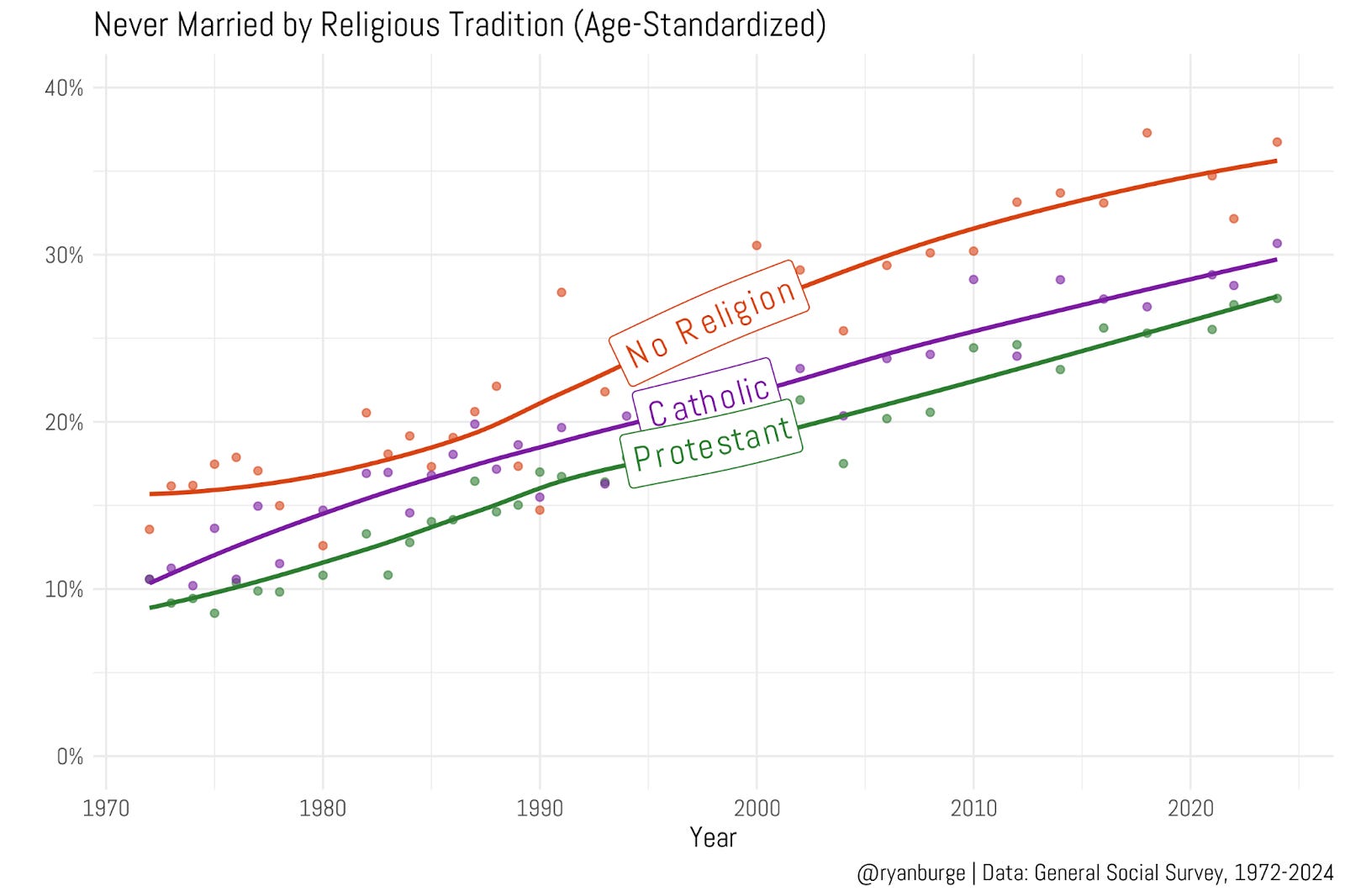 I age-standardized the data to account for the fact that the nones are much younger than Protestants or Catholics. What that means is that I calculated the share never married at each age for each religious group, then applied a standard age distribution across all three groups. This removes the confounding effect of age differences. And, as you can see, this does narrow the distance between the groups somewhat.