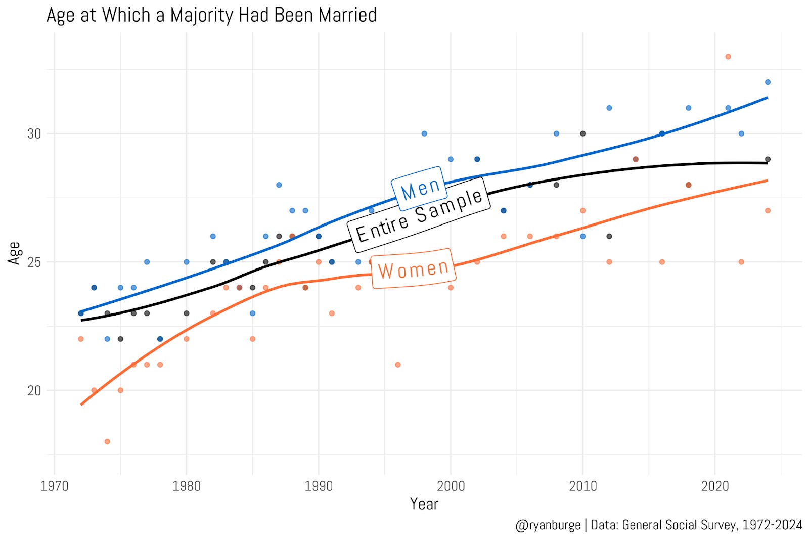 But I wanted to come up with another metric that would help make this concept seem more “real” to us. So, here’s what I did—I calculated the age in the data at which the “never been married” rate dropped below 50% for the first time for each year of the GSS. So this is basically the “tipping point” for marriage over time.