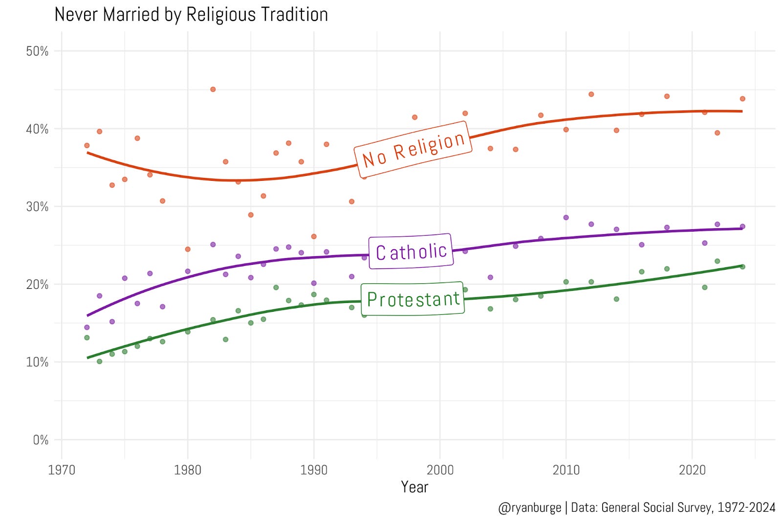 I do feel the need to point out that Catholics have always been less likely to tie the knot compared to Protestants, too. I don’t know if I would have guessed that. It’s pretty noteworthy how the lines just seem to run in parallel, too. No matter what year you look at, a Catholic is about five percentage points more likely to say they’ve never been married compared to a Protestant.