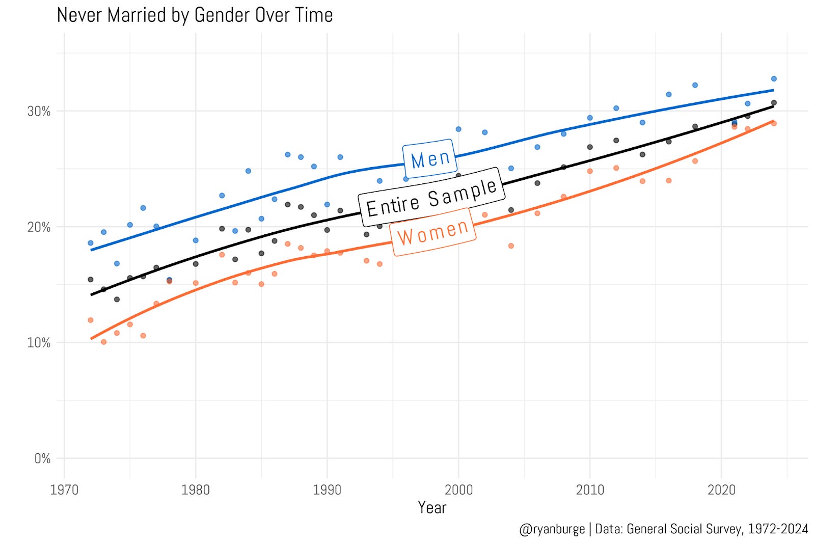 And we can certainly blame men for this problem! That’s another consistent finding from the GSS—male respondents have been noticeably more likely to always be single compared to their female counterparts. In the 1970s, the gap was just about eight percentage points (10% vs. 18%). And it’s maintained a pretty healthy gap for most of the last five decades. Although, I do want to point out that it’s narrowed noticeably in the last few years. In 2024, about 33% of men had never been married compared to 29% of women. You can chalk a lot of that convergence up to the female line rising faster than the male line.