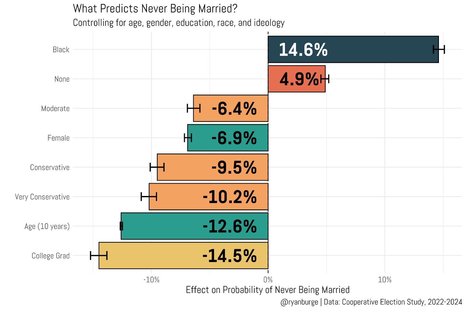 I found a bunch of factors that drive up marriage rates—those are at the bottom of the graph. The most predictive was being a college graduate. Someone with a four-year degree is about 15 percentage points more likely to have tied the knot compared to someone with less education. Obviously age was a strong predictor of marriage rates, but so was political ideology. Compared to a liberal, a conservative was about 10 percentage points more likely to get married. A moderate was about 6 points more likely, as well. And, as we observed before: women are more likely to get married compared to men (by about 7 percentage points).