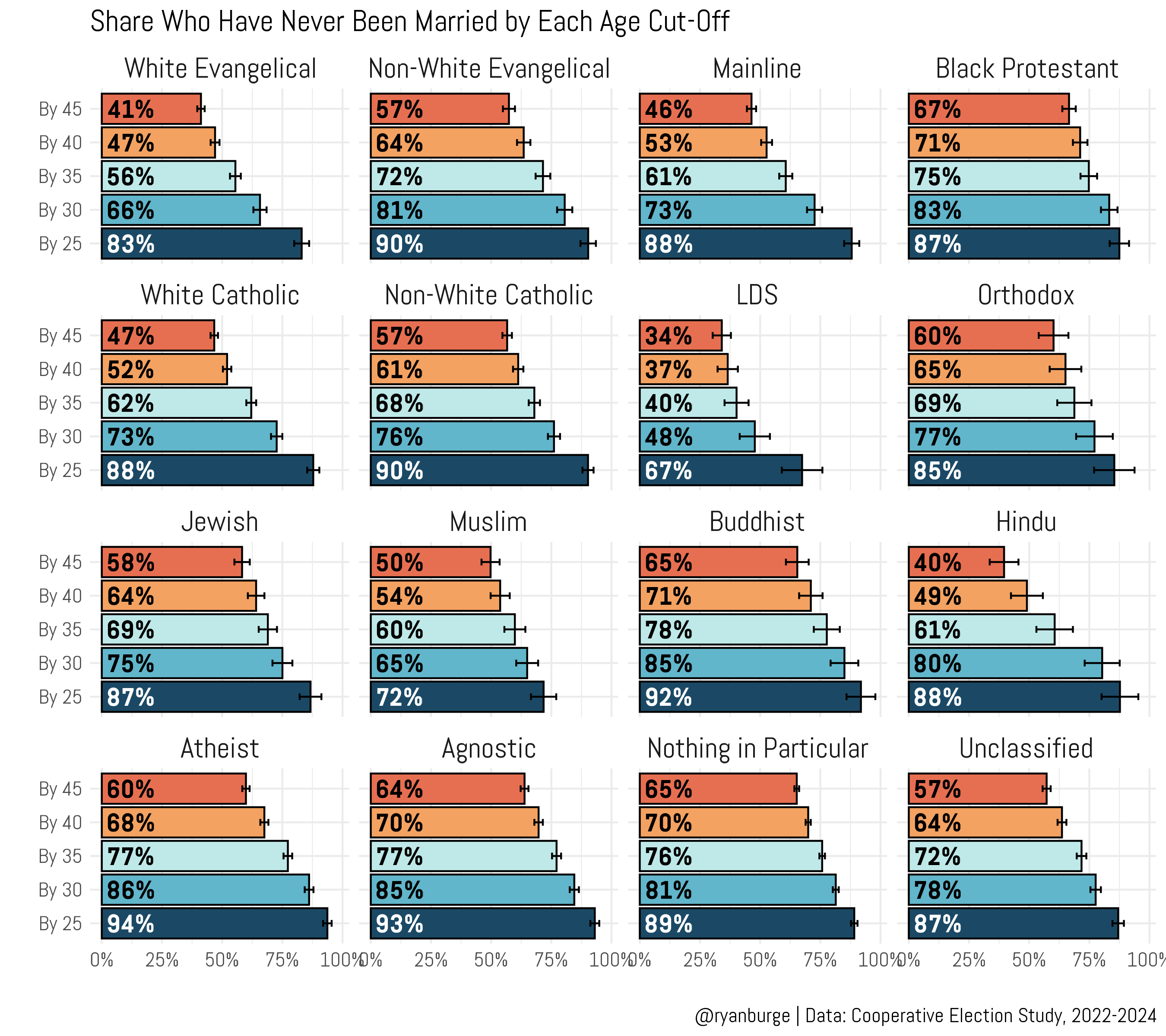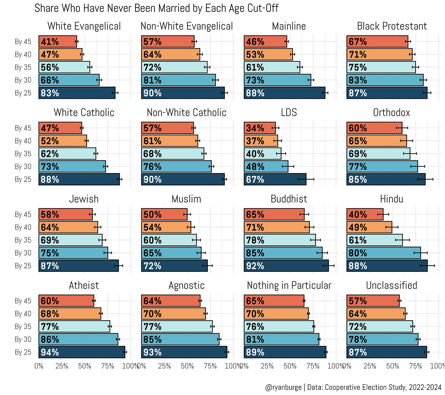 I’ve got to say—I love this graph. I’ve stared at it multiple times over the last couple of days because I always see something really interesting. For instance, the Latter-day Saints just jump off the screen for me. Only 67% of them were still single by their 25th birthday. The next closest group on this metric is Muslims, and 72% had not walked down the aisle by this checkpoint. All those tropes about Mormons and marriage really are accurate—they get married YOUNG compared to everyone else.
