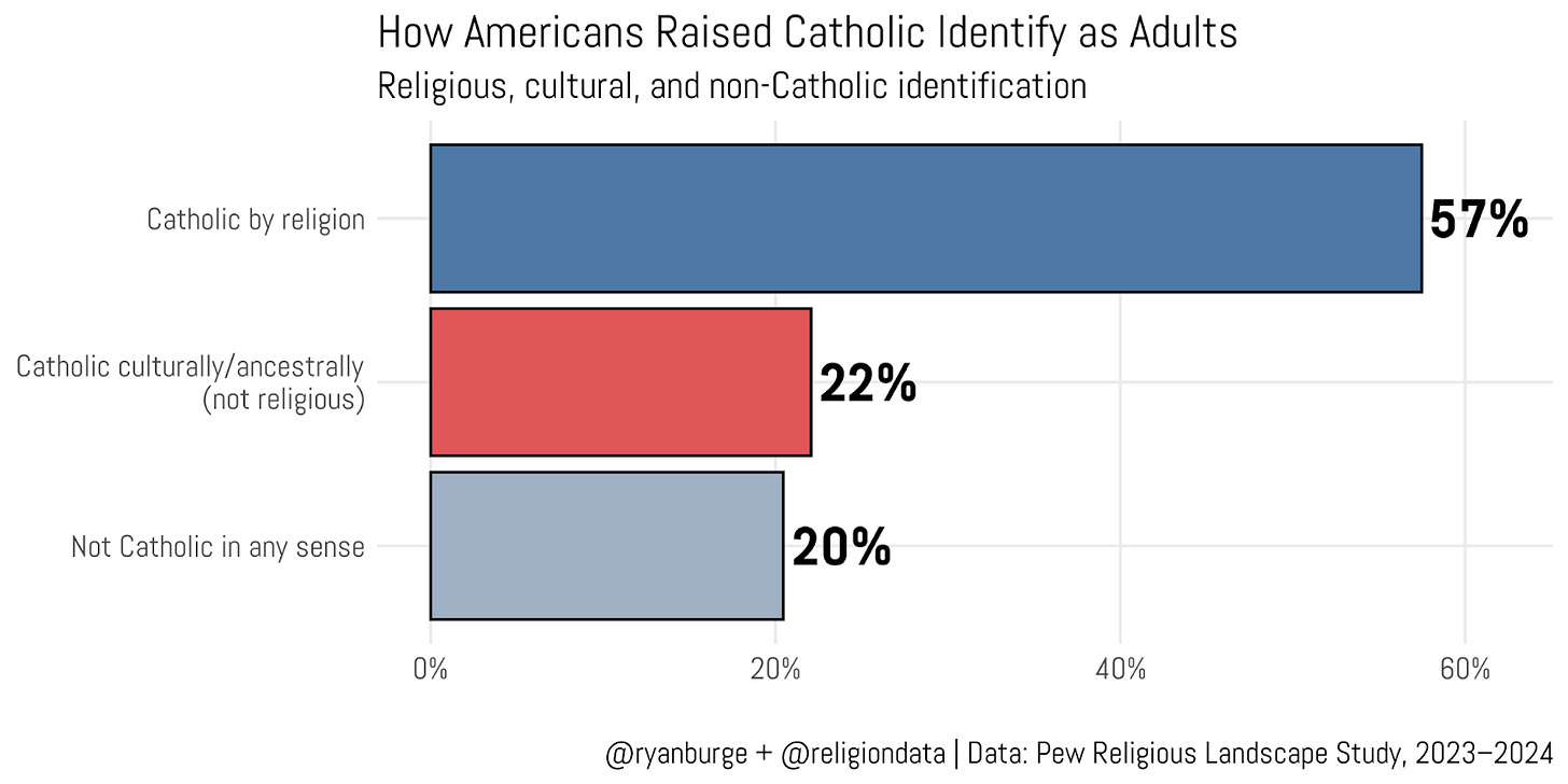 Among these cradle Catholics, about three in five still identify as religious Catholics in adulthood. Another 22% did not select Catholic when asked about their current religious affiliation, but did respond affirmatively to the follow-up question about Catholic identity.