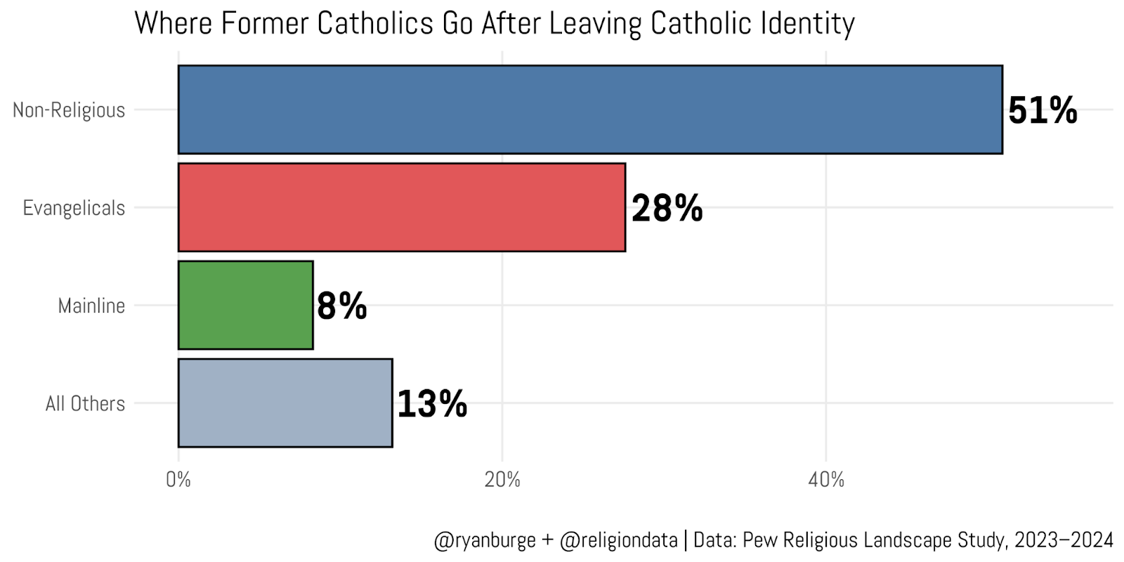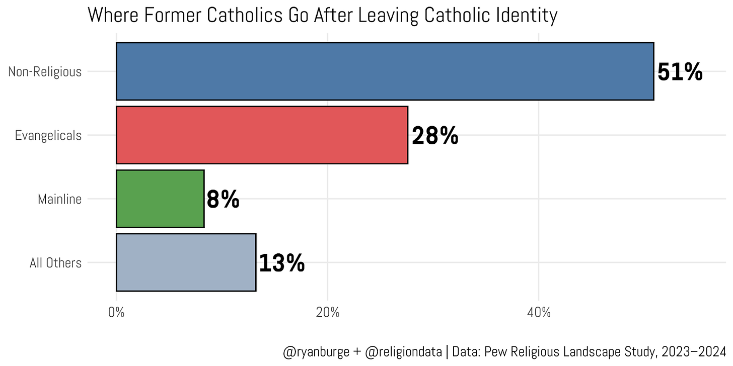 It’s helpful to place these numbers in a broader context. Remember, only about 20% of people raised Catholic leave Catholicism entirely. That means roughly 1 in 10 people who were baptized Catholic end up non-religious in adulthood. About 7% of Catholic-raised respondents move into a Protestant church, and only 3% shift into another faith tradition altogether.