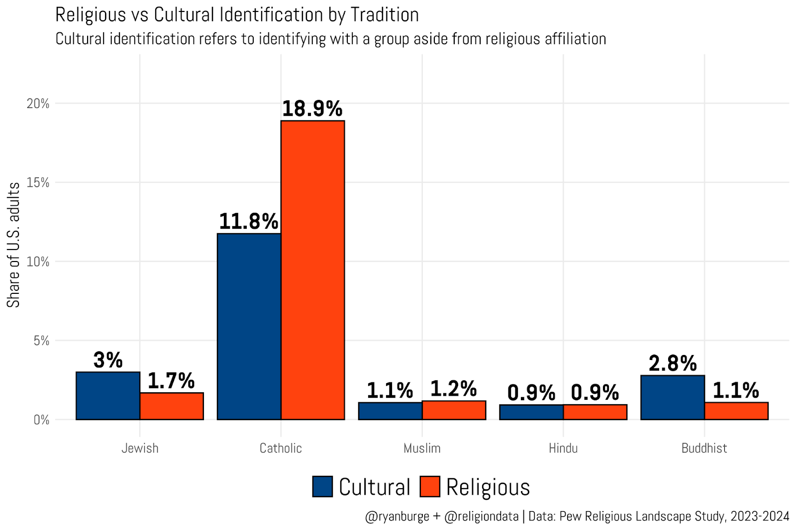 As for the remaining three groups, the samples are much smaller, so these estimates should be taken with a grain of salt. For Muslims, the religious and cultural shares are about equal—roughly 1% each. The same is true for Hindus. Buddhism looks a bit different: cultural Buddhism is considerably more common than religious Buddhism (2.8% versus 1.1%).