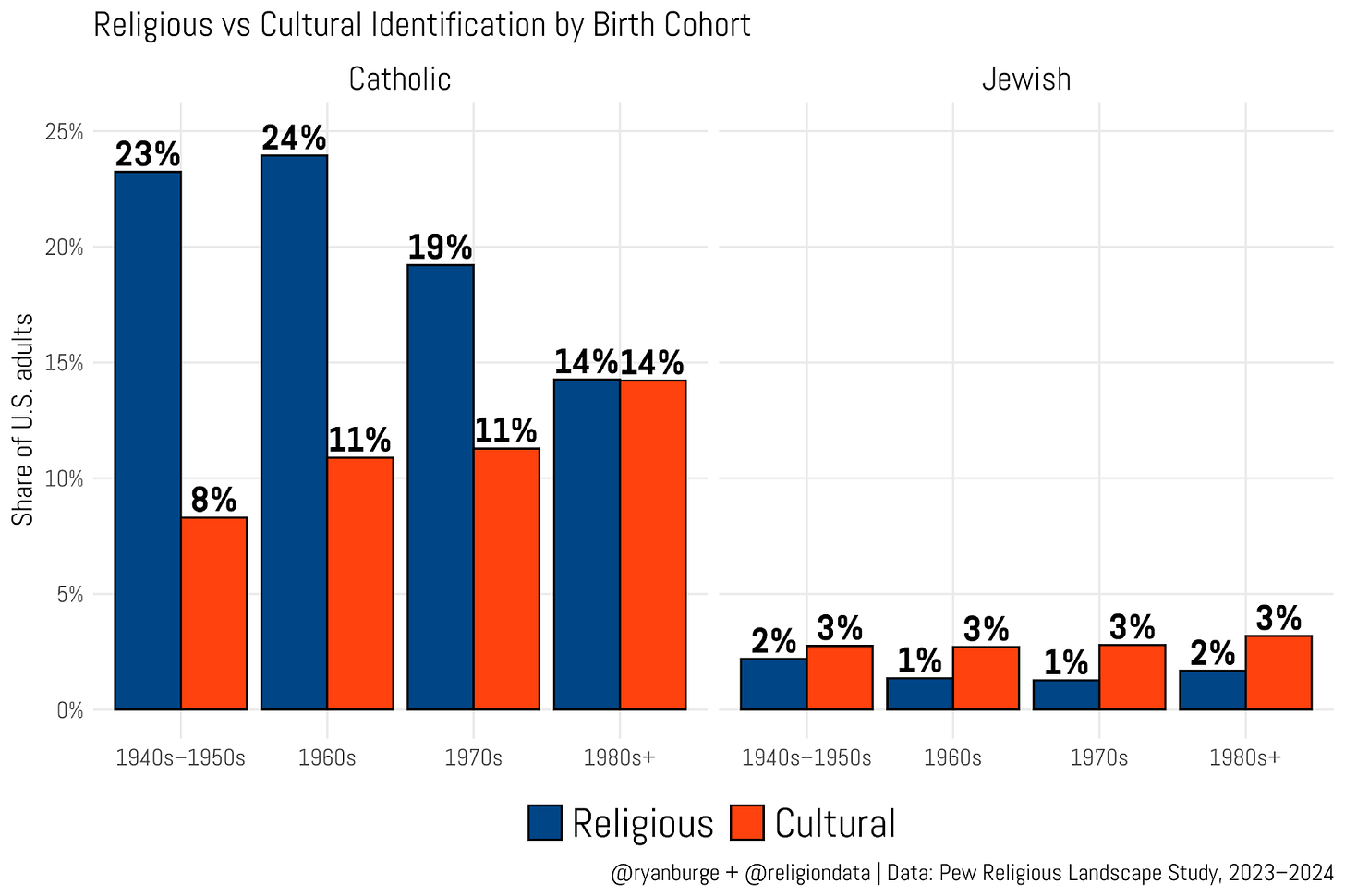 But things begin to change with those born in the 1970s. The share of religious Catholics drops by about five percentage points, while the cultural Catholic share remains rock steady at 11%. Then look at the youngest cohort. Among people born in 1980 or later, 14% identify as religious Catholics—and the exact same share say they are cultural Catholics.