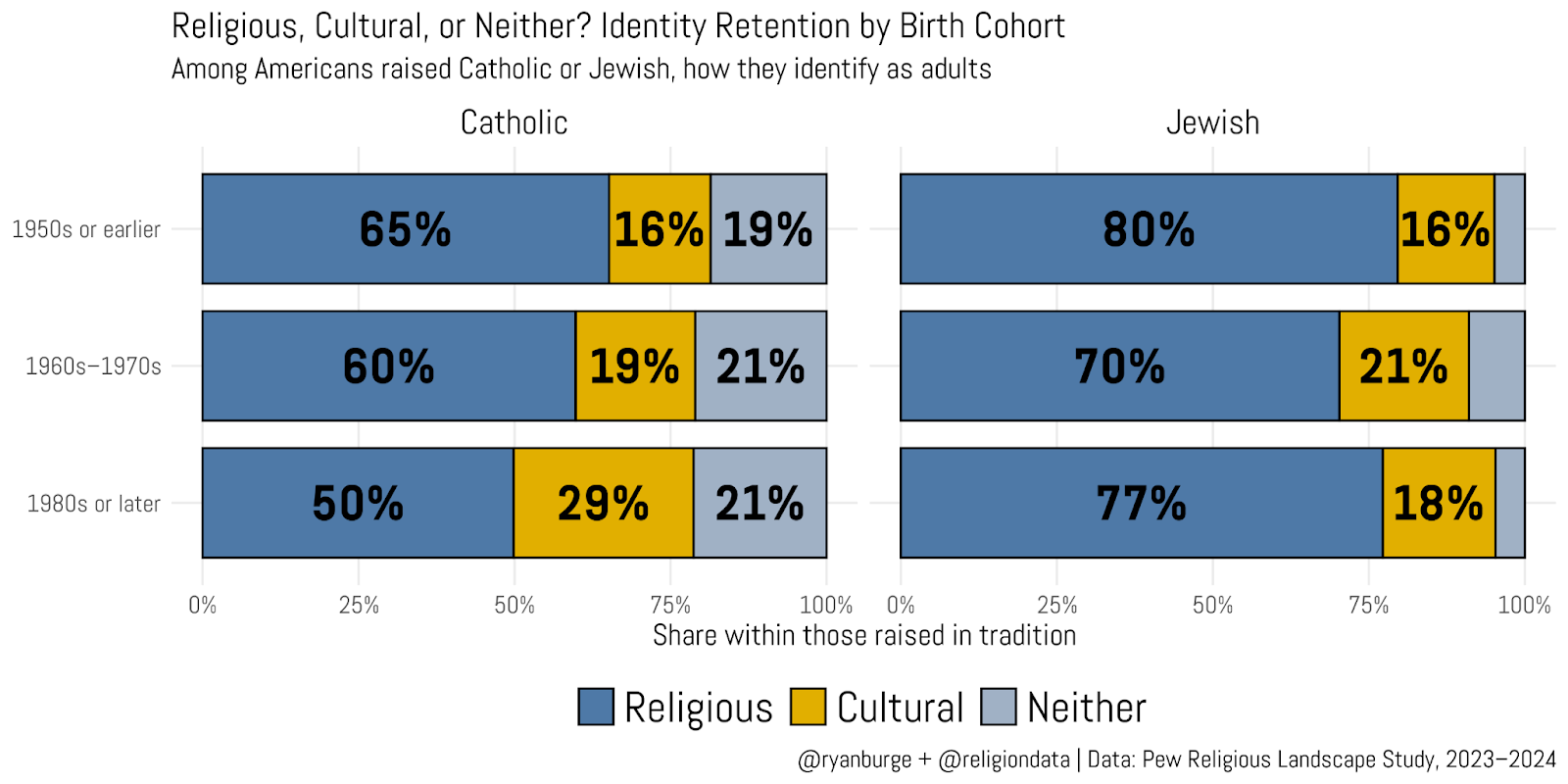 The Catholic story is more clearly defined. Among those born into a Catholic household before 1960, about two-thirds still report Catholicism as their religious affiliation in adulthood. That share drops to 60% for people born in the 1960s and 1970s, and falls further to 50% among those born in 1980 or later. At the same time, the share of younger adults who identify as culturally Catholic rises to nearly 30%, almost double the rate among the oldest Catholics in the sample. What’s worth flagging, however, is what doesn’t change: the share of cradle Catholics who are not Catholic in any way as adults is essentially constant across cohorts, hovering right around 20%.