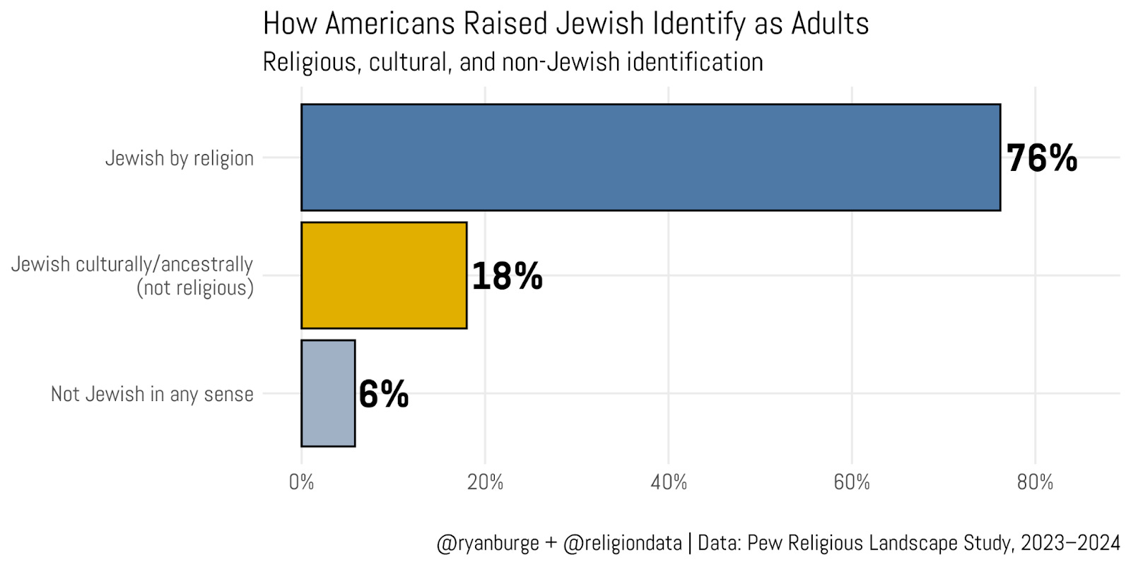 I wish I could offer a detailed breakdown of the current religious identities of that remaining 6%, but you can probably guess what comes next—the sample just isn’t large enough. The survey includes about 850 respondents who were raised Jewish, and 6% of that is roughly 50 people. That’s simply too small a group to support any strong conclusions.