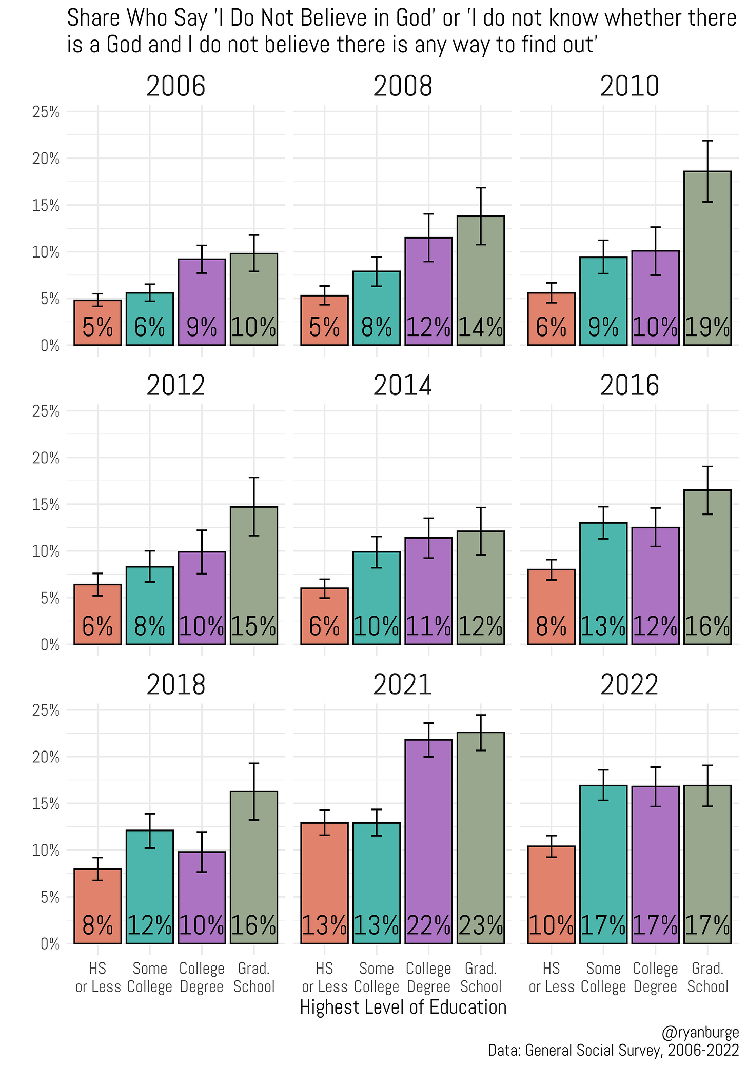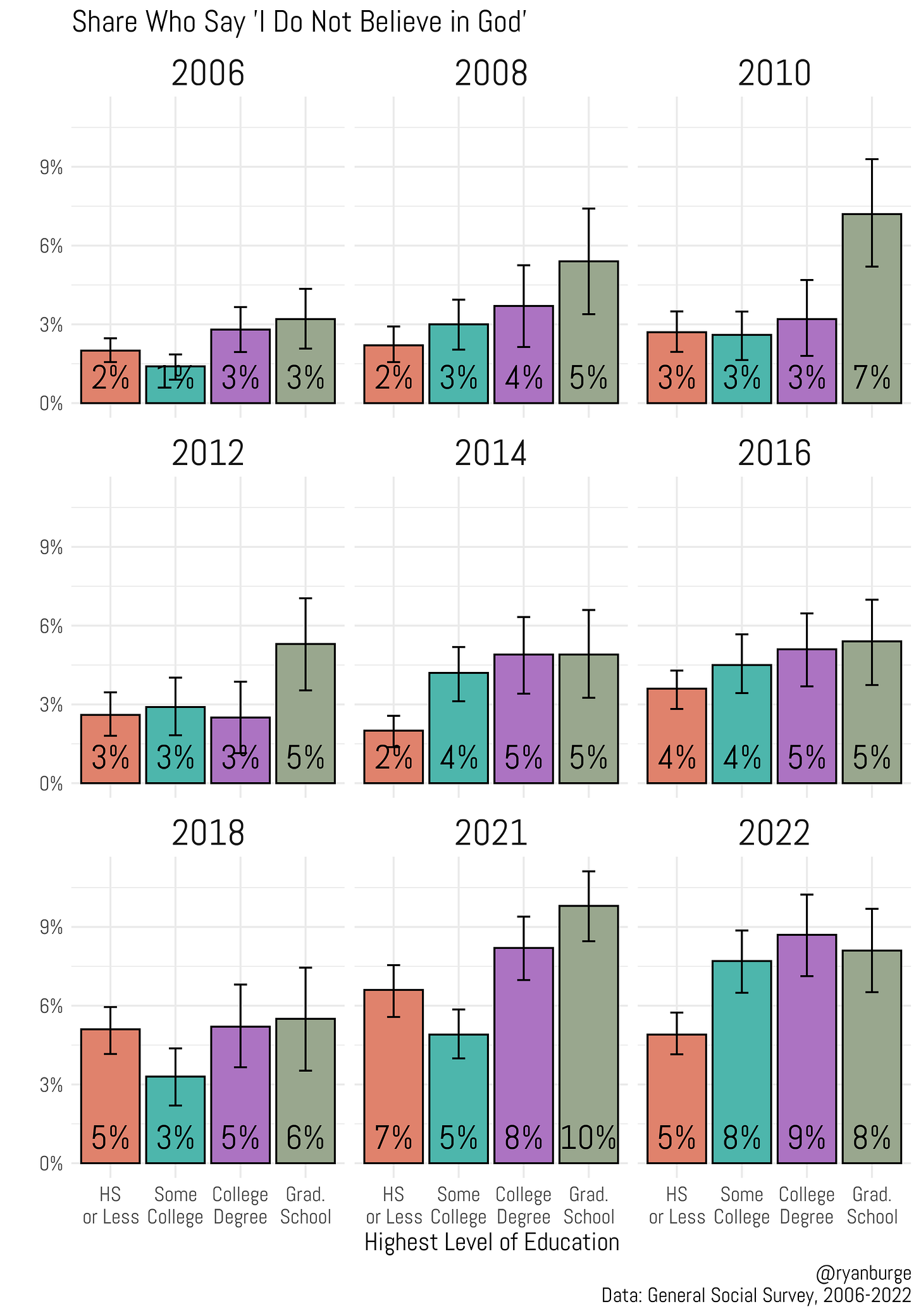 Let’s add the education piece to the mix now. I calculated the share who expressed an atheistic belief in God by four levels of education. I did that for every wave of the GSS since 2006.