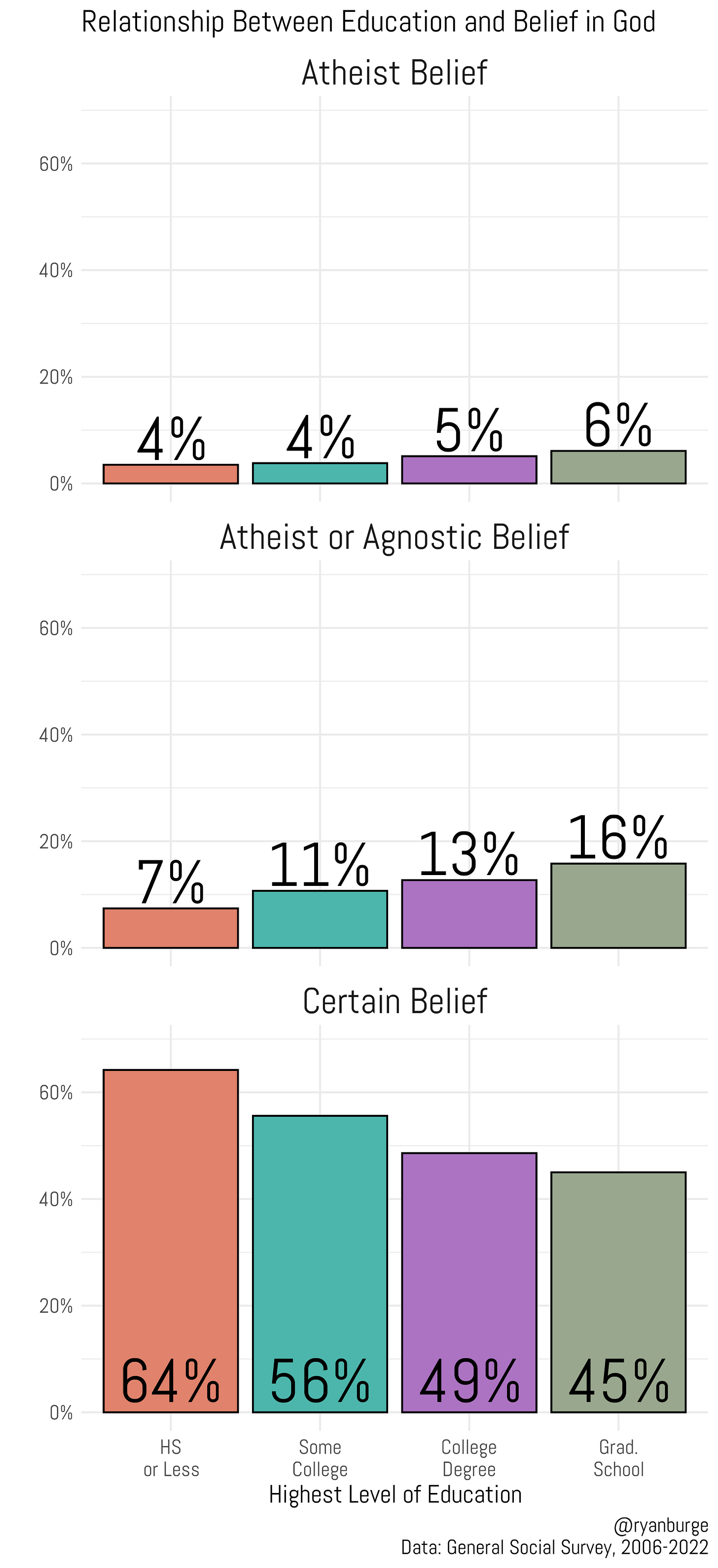 Okay, I think this does bring things into sharper focus. In some years, there’s a clear stair-step in the trend line. Higher levels of education lead to a greater likelihood of having an atheist or agnostic view of God. But it’s certainly not consistent across every survey, especially in the last couple of years. In 2021, there was no difference in belief among those with some college credits compared to those with a graduate degree. That was also the case in 2022, too. I think it’s generally (but not universally) true that education is positively related to an atheist or agnostic view of God.