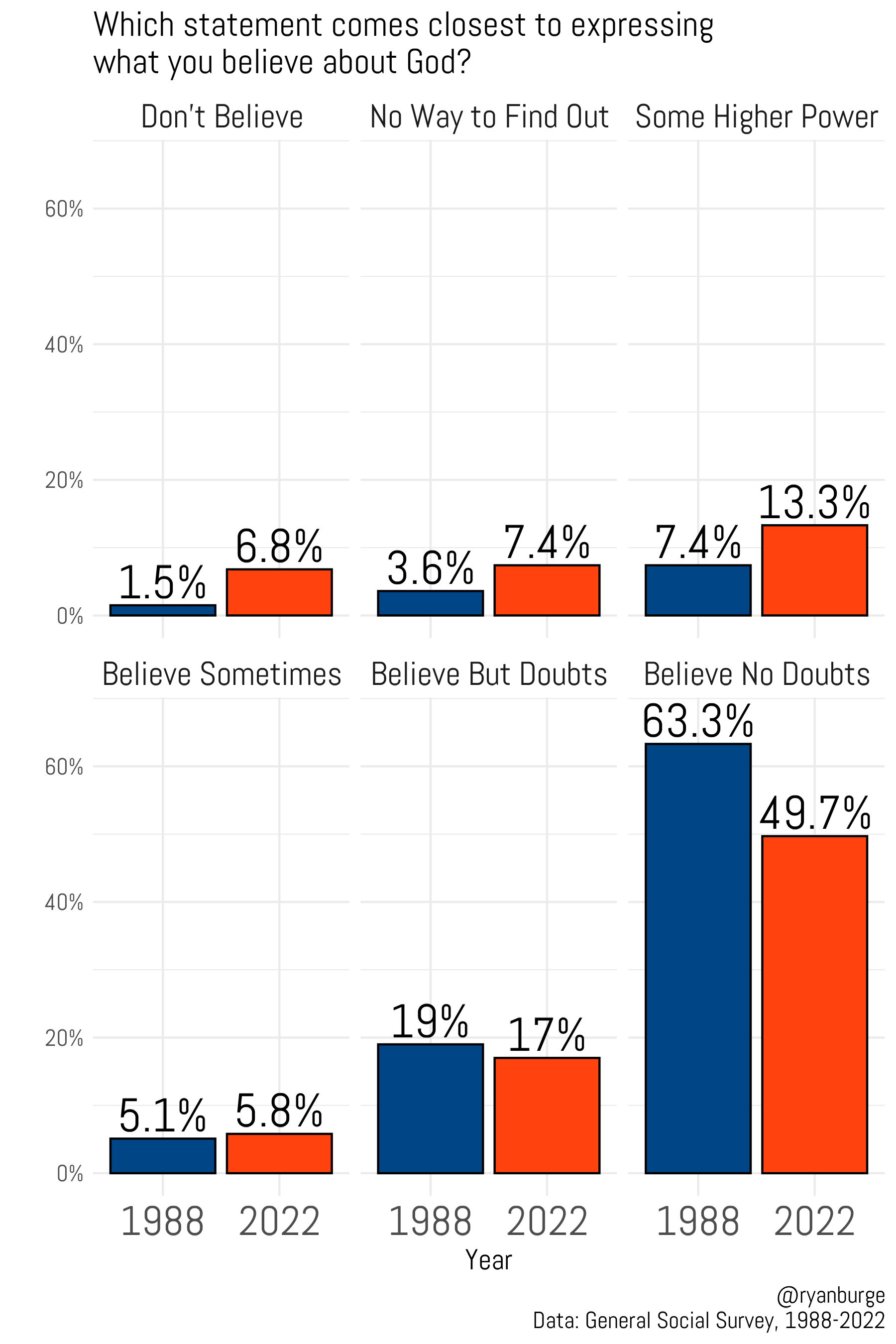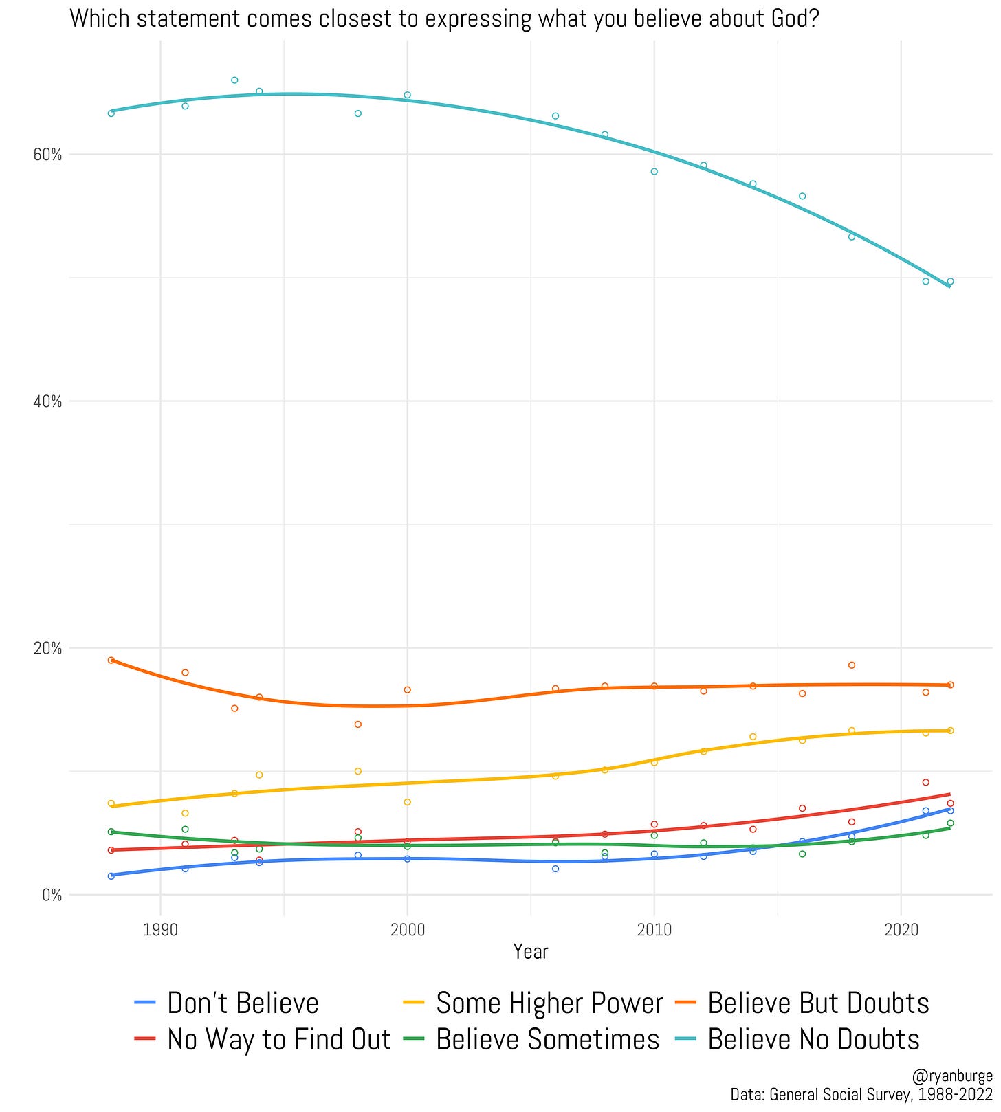 This graph isn’t great, to be honest. This is a big problem in data visualization: one response option is clearly much more popular than the other ones. It throws off the scale for all the others. But you can get the gist here: the certain belief in God number was incredibly high in 1988—over 60%. It’s clearly declined a bunch since 2000. Now it’s about 50%. The other lines don’t look like they are moving up or down too dramatically. But let me visualize this in a (hopefully) more helpful way.