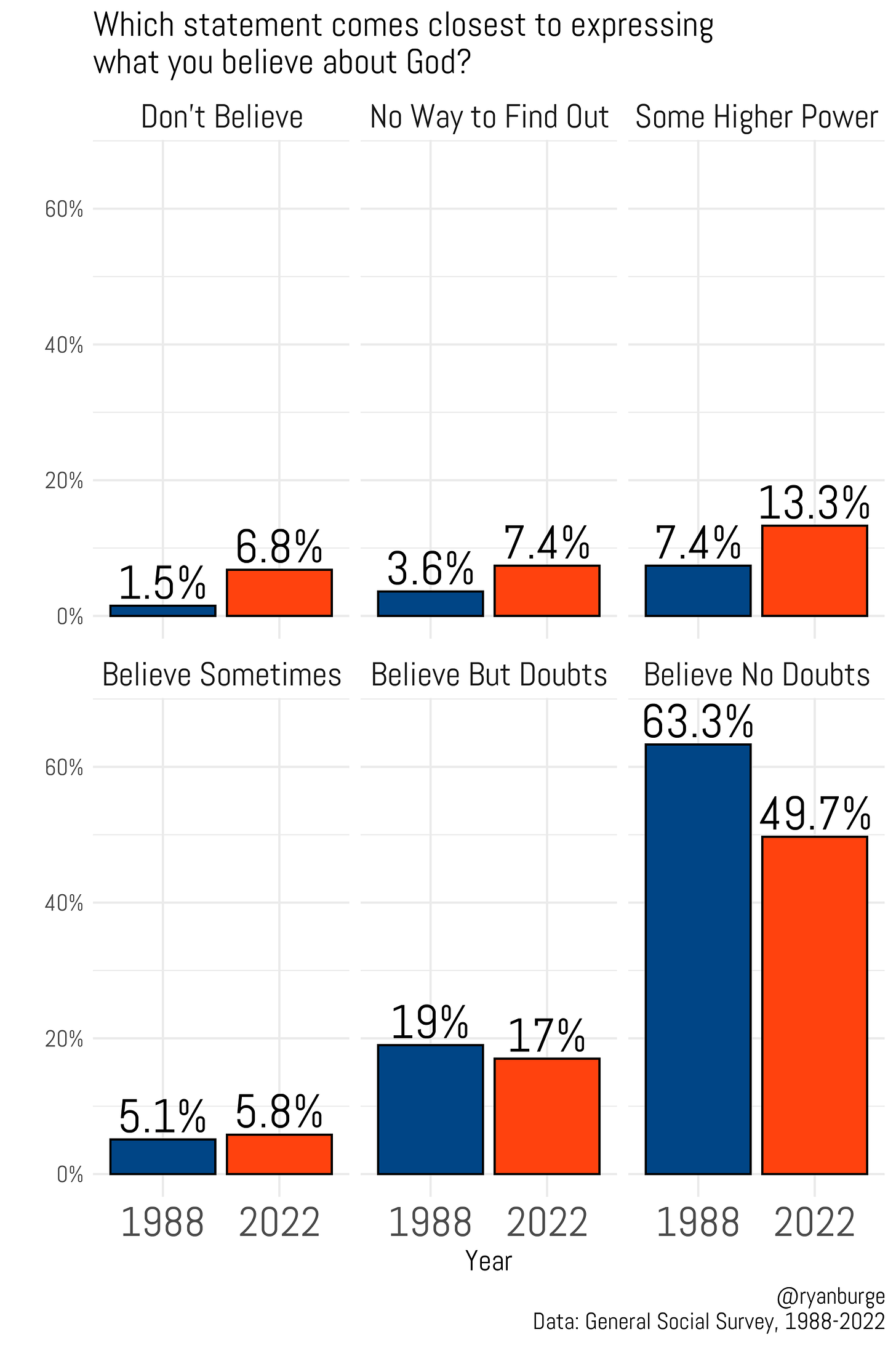 The share of Americans who expressed a certain belief in 1988 was 63%. It declined to just about half of the sample in 2022. Despite this numerical decline, it’s still very much the most popular response option, though. Today, there are over three times as many people with a certain belief in God than those with an atheist or agnostic belief.