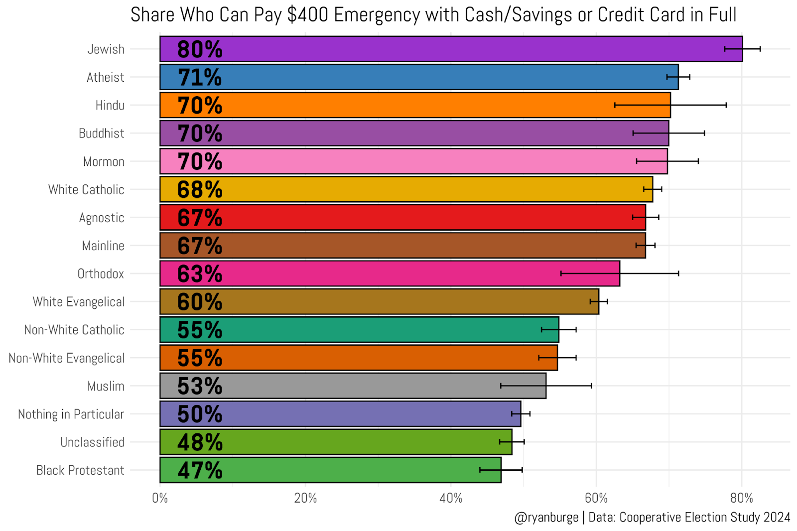Almost every group is above 50% on this metric, and many groups are far above a majority. For instance, 80% of Jews would have little problem with an unexpected expense. They are followed by atheists, Hindus, and Buddhists. Anyone who has followed my work for the last couple of years knows why these traditions show up at the top of the graph—they tend to be on the upper end of the income spectrum.