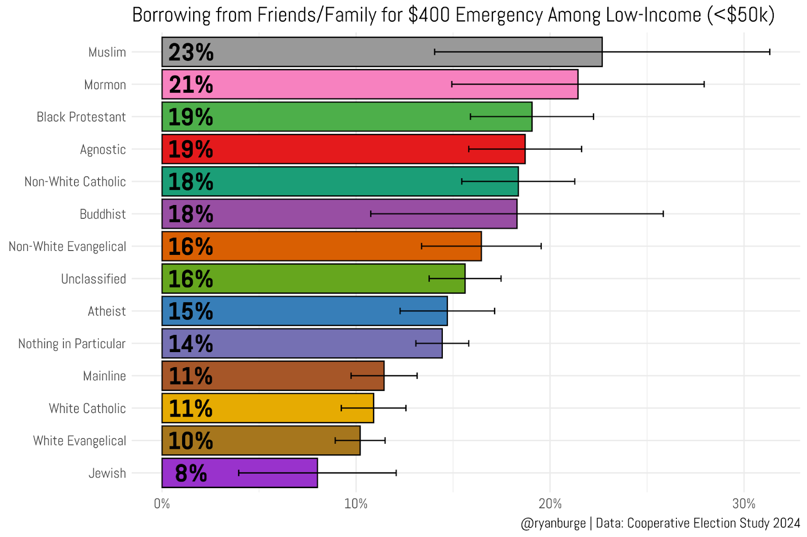 I think this is a fascinating result because I have absolutely no idea what to make of it, honestly. I went into this thinking that religions that tend to have a stronger communal component—like Islam and Latter-day Saints—would be more able to tap into social networks to come up with the money. The data does point to this reality. Both those groups are at the top of the list, along with Black Protestants, which logically follows.