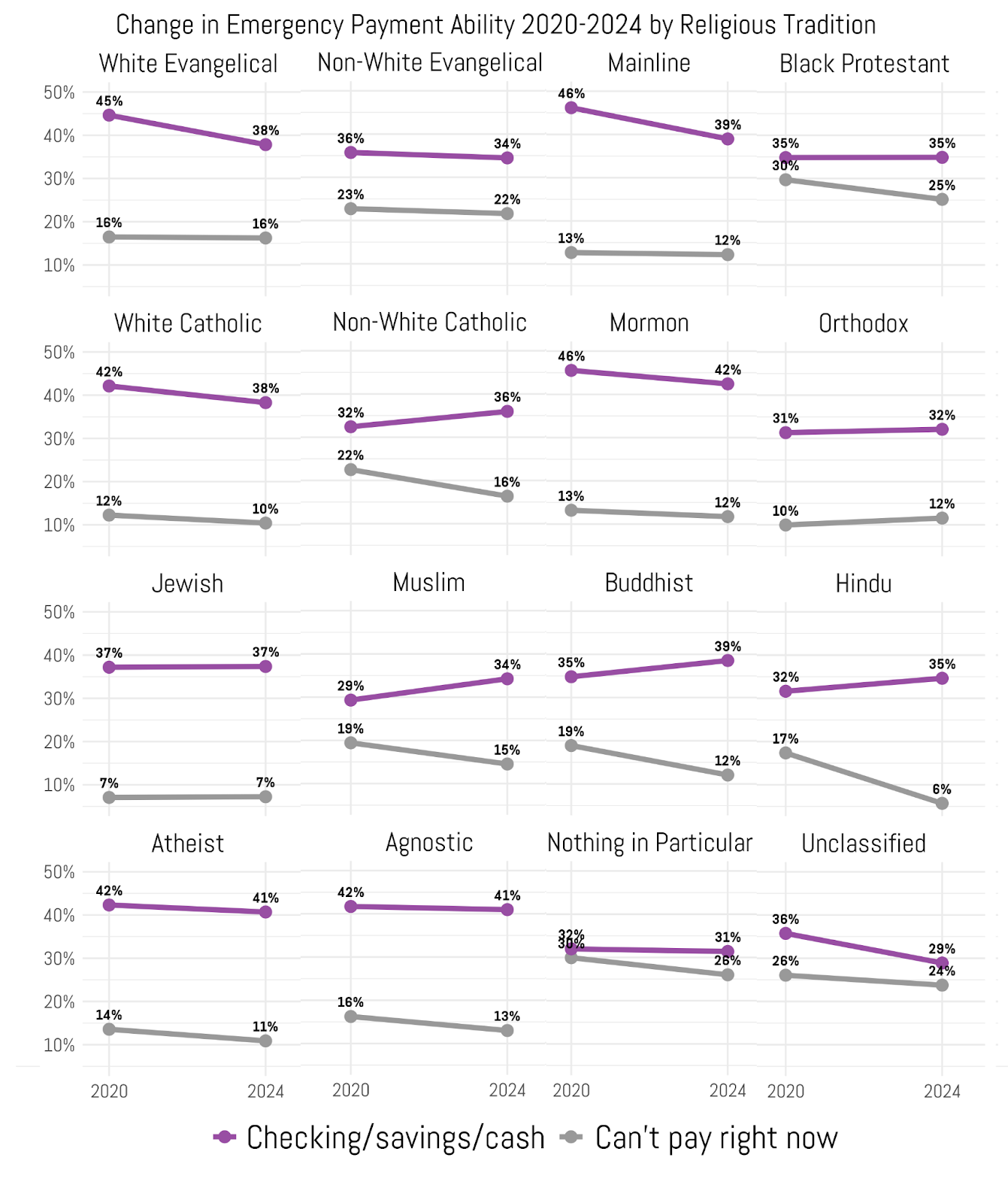 It’s interesting to see which religious groups seem to be doing better in 2024 compared to 2020 and which ones were doing worse. For instance, white evangelicals seem to have a deteriorating financial situation. In 2020, 45% could pay the bill with cash. That dropped to 38% in the 2024 data. That’s also true of mainline Protestants—down seven percentage points. There’s also a four-point dip among white Catholics. But what’s funny about those three groups is that the share who just flat-out can’t pay didn’t really change too much during this time period.