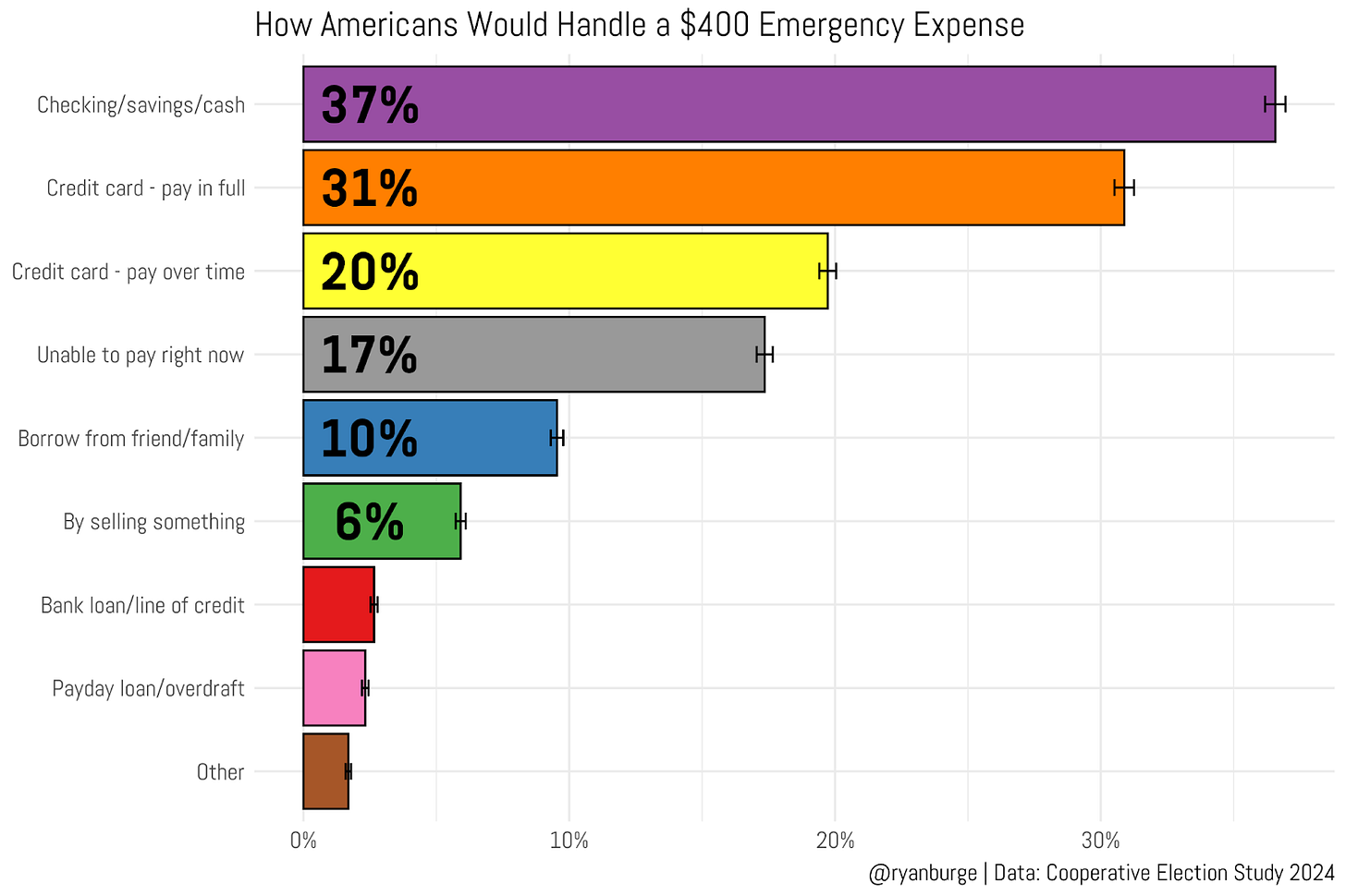 There’s this question battery in the Cooperative Election Study that asks about the respondent’s financial situation in an intriguing way: Suppose that you have an emergency expense that costs $400. Based on your current financial situation, how would you pay for this expense? Then they are given this long list of possible options, and they can check all that apply (but they do have to check at least one box). This is how respondents answered that question in the 2024 survey.
