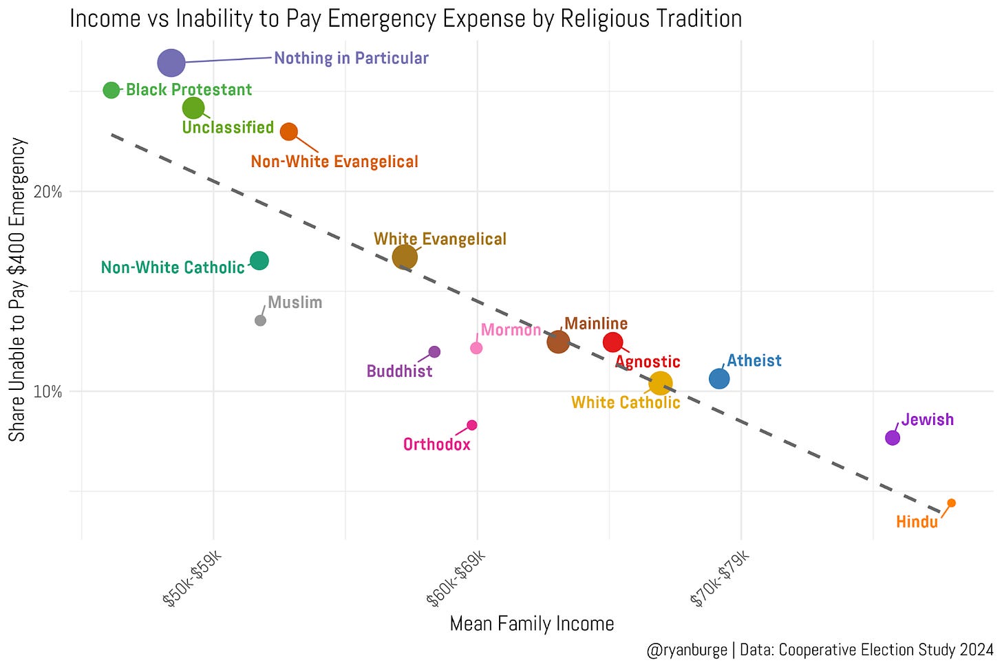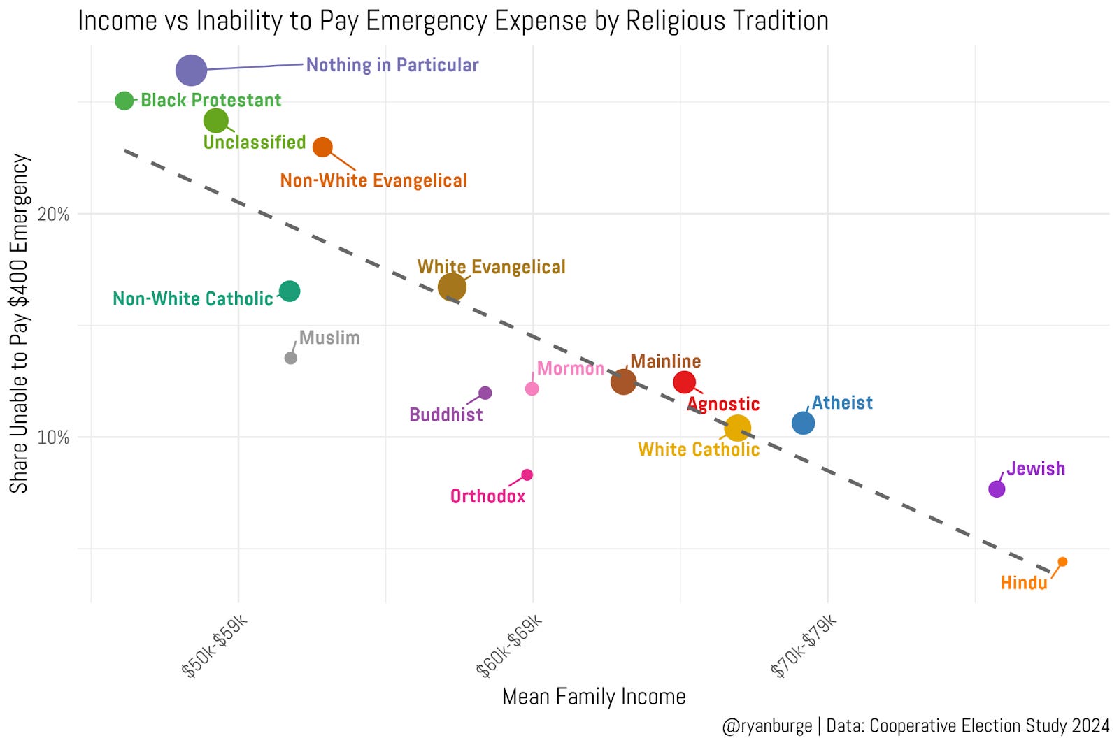 I don’t think anyone is going to be too surprised at seeing the downward trajectory of the trend line. Traditions with higher incomes are more likely to be able to come up with $400. You can see that with both Jews and Hindus. In each case, less than 10% couldn’t find the money in a pinch. They also both have incomes that are closer to $80K per year.
