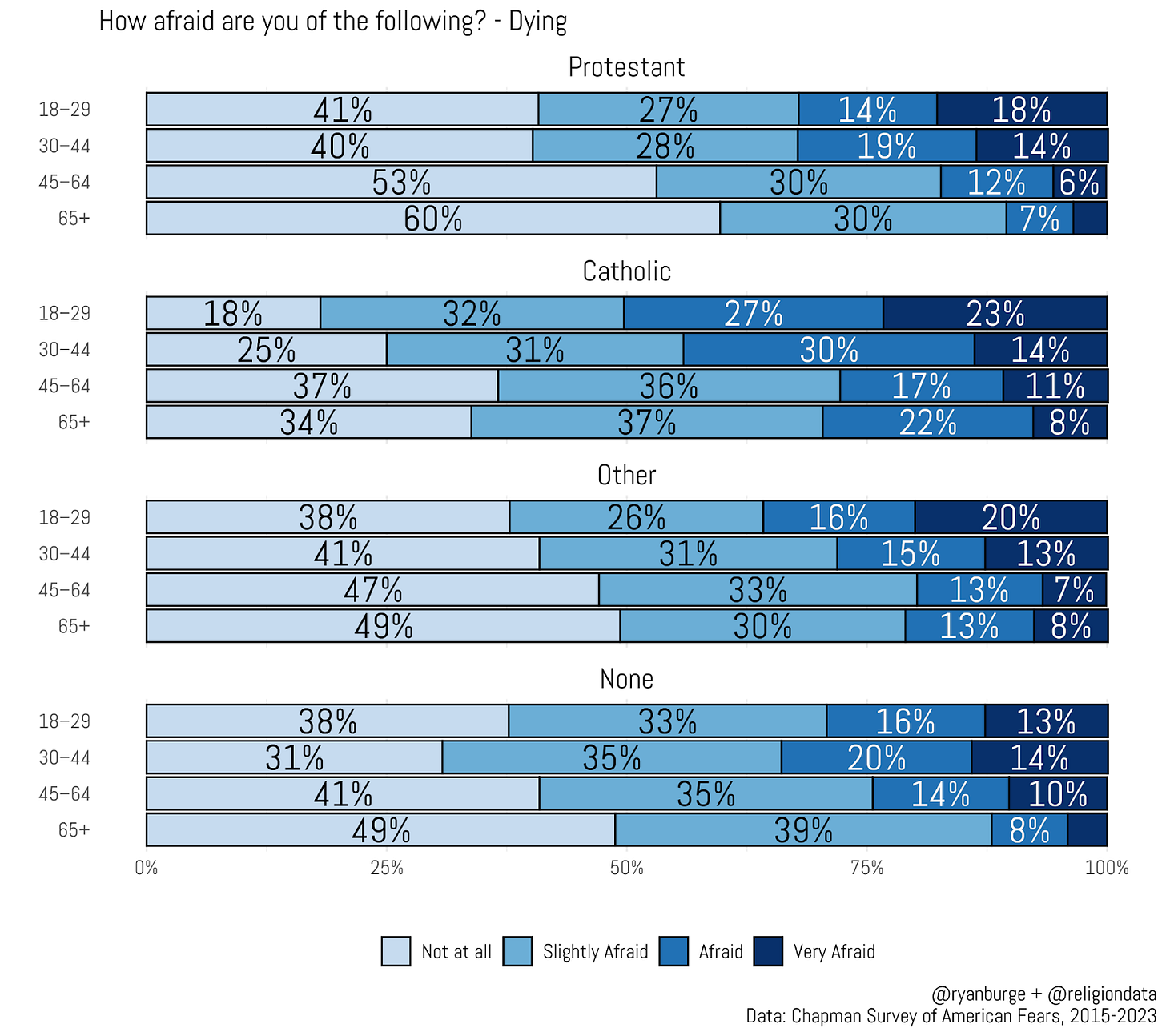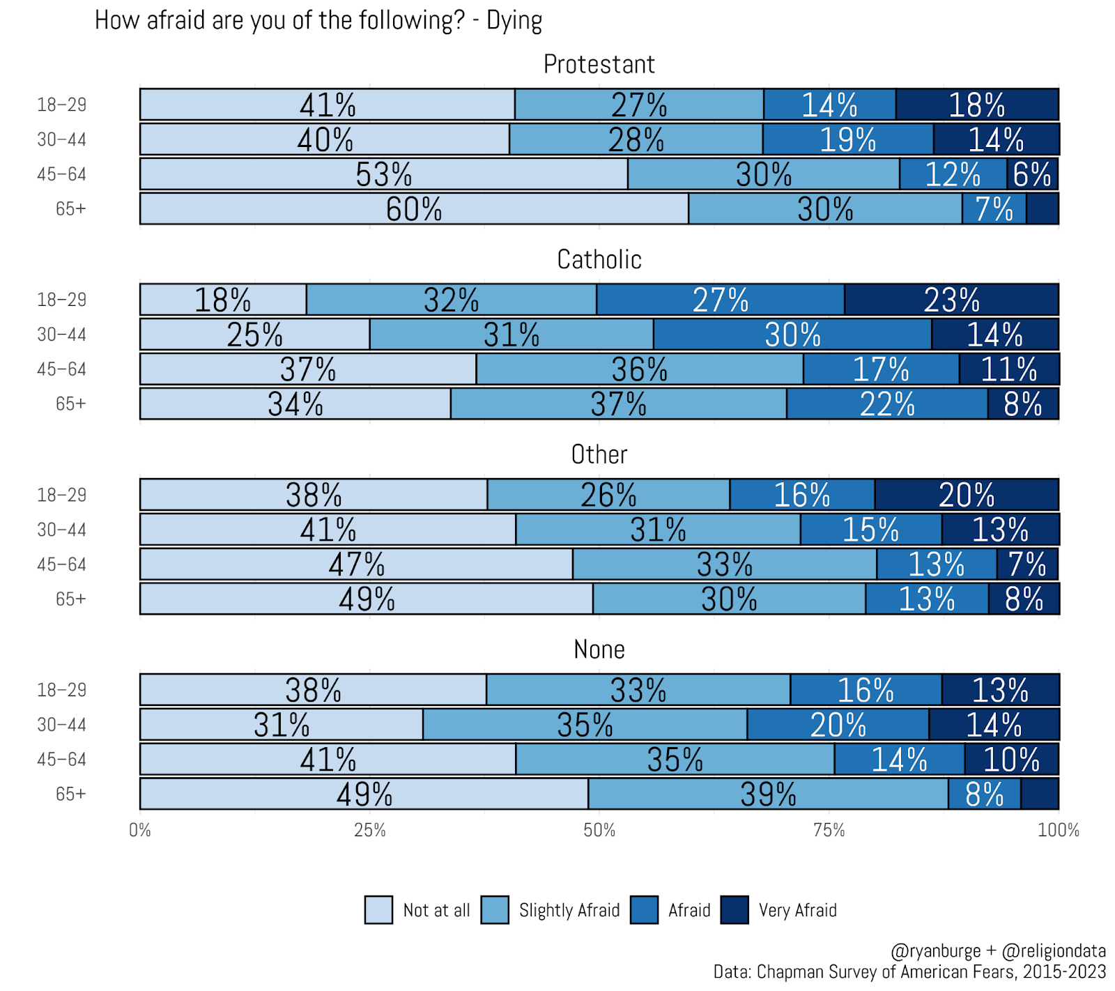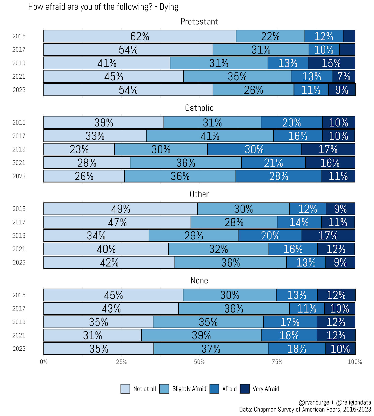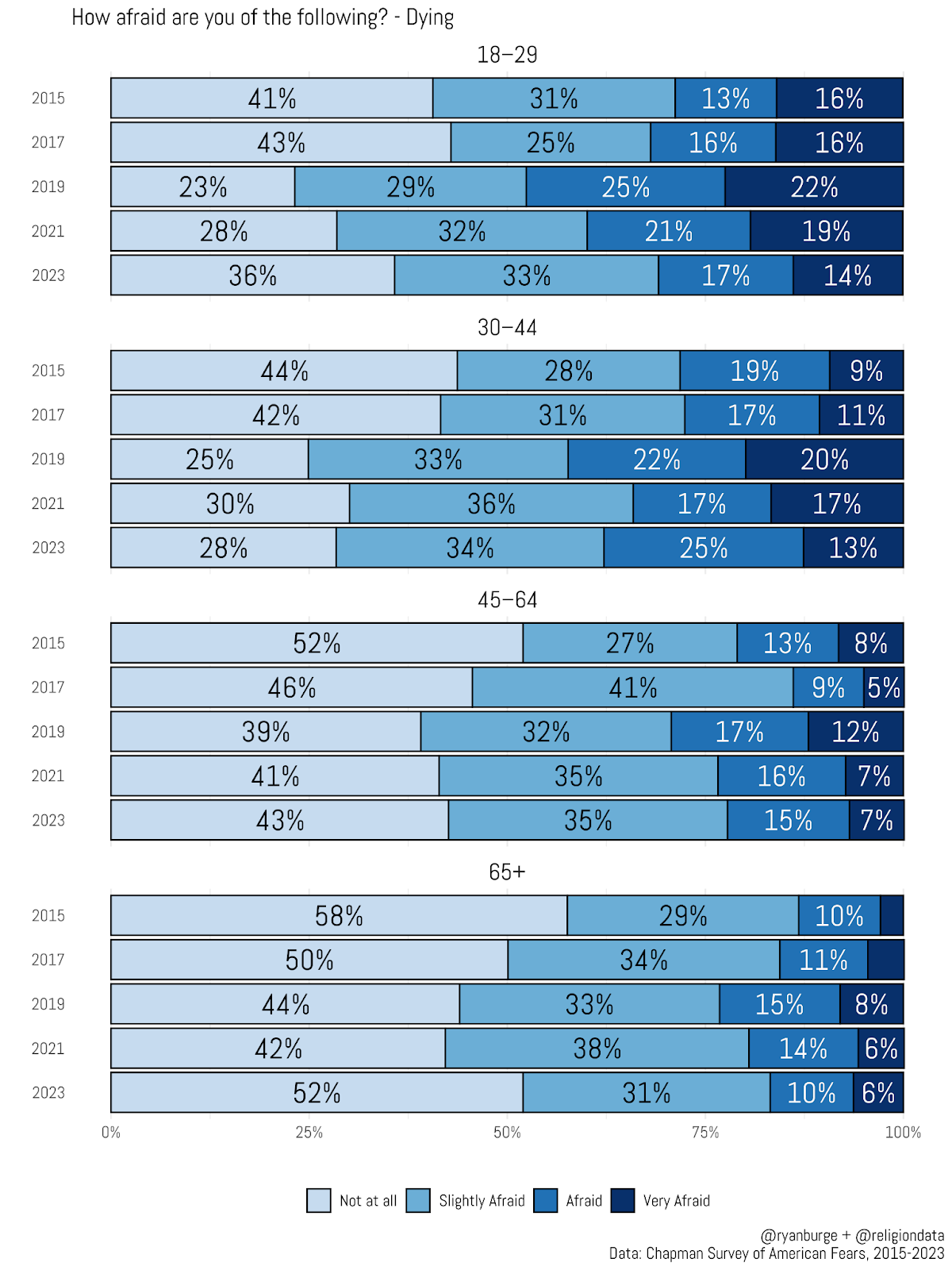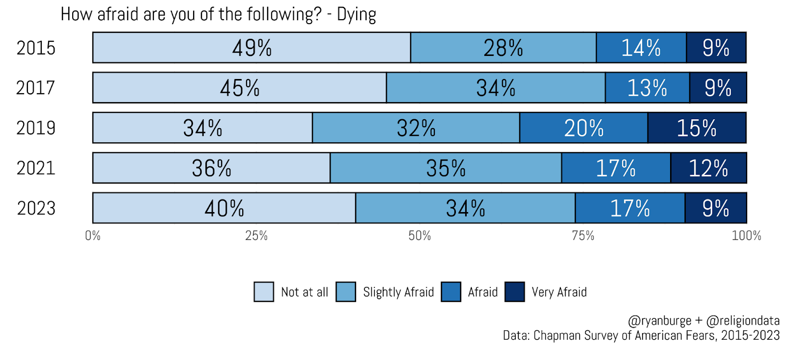 The Association of Religion Data Archives (ARDA) has been publishing a dataset called the Chapman University Survey of American Fears since 2014. The questionnaire has gone into the field nearly every year over the last decade, and one single question caught my eye: How afraid are you of dying? The four response options ranged from “not at all afraid” to “very afraid.” I calculated responses to that question from the surveys fielded in 2015, 2017, 2019, 2021, and 2023.