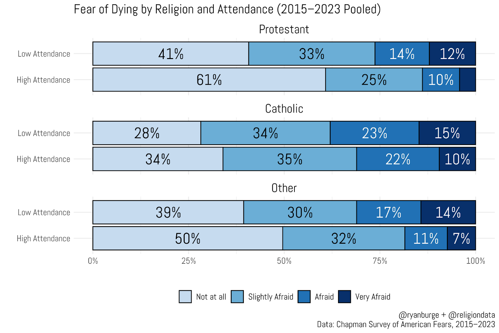 It’s really noteworthy to me how this variable plays a much bigger role among Protestants than it does among Catholics. For Protestants who go to church on a regular basis, there’s a significantly lower level of expressed fear. Among low attenders, 41% report no fear of death. That figure jumps to 61% among Protestants who attend regularly. Just 4% of high-attending Protestants were very fearful, compared to 12% who didn’t attend as much.