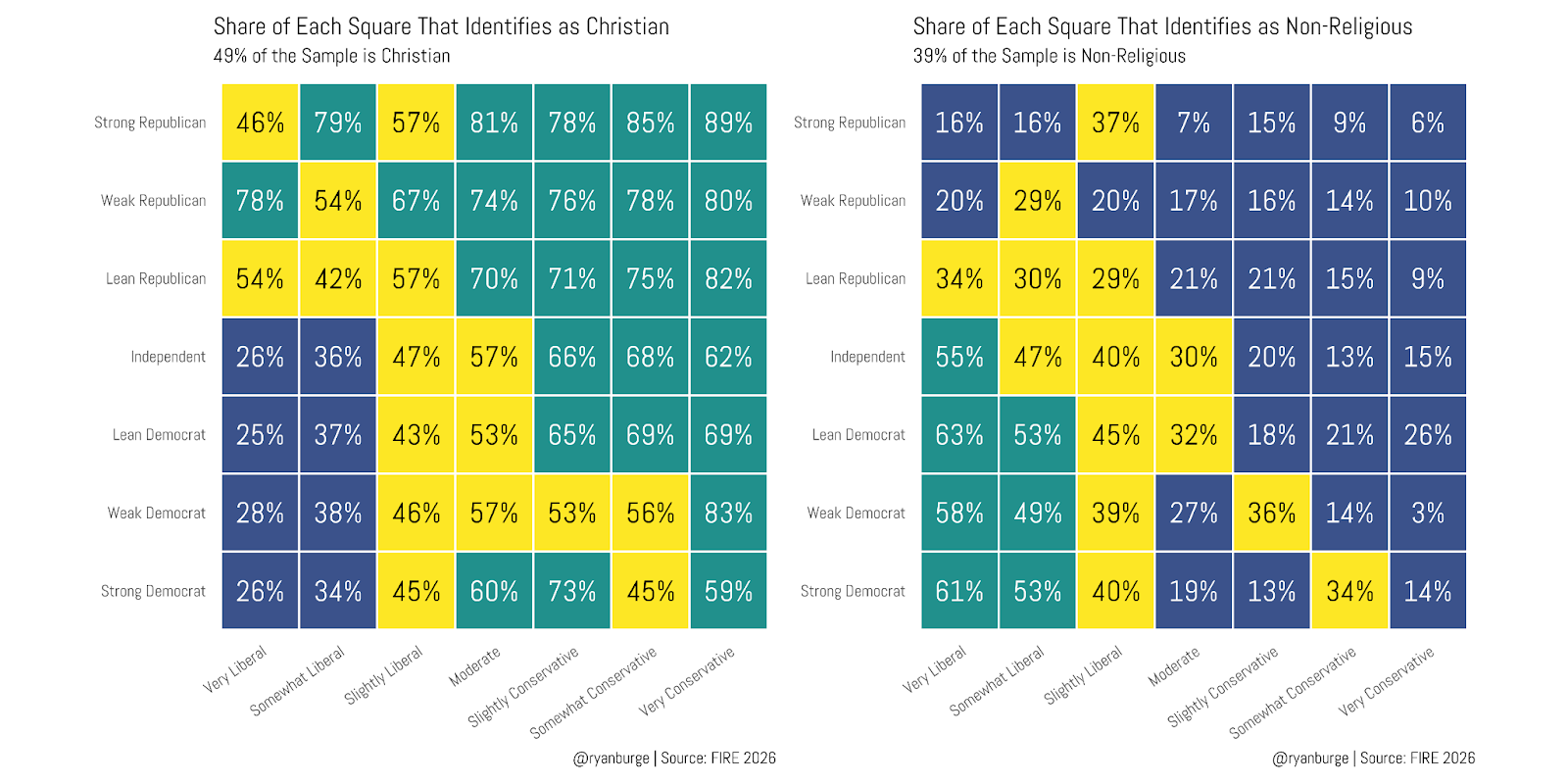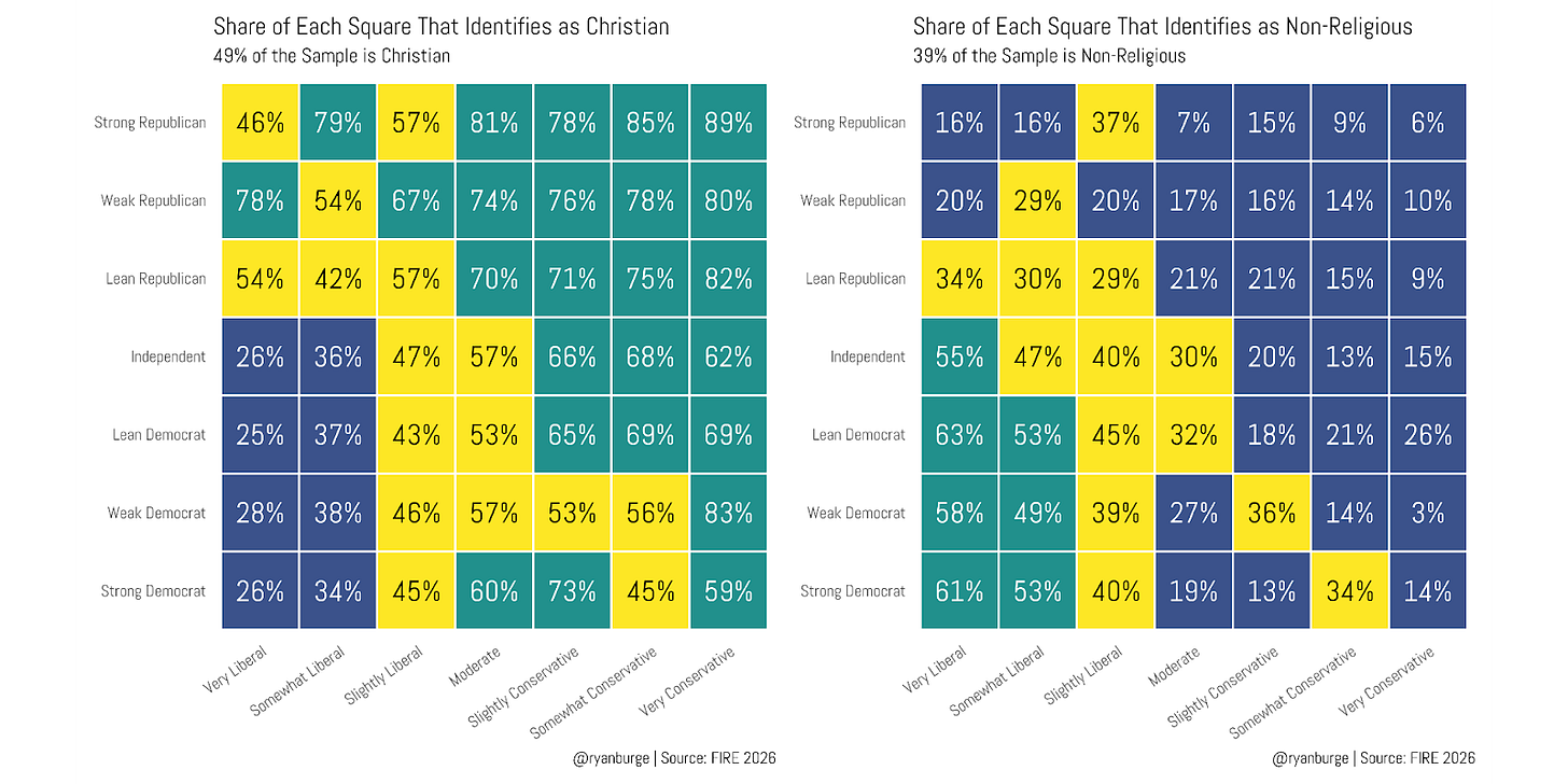 In the full sample, about 49% of all respondents said that they were Christians. Where do they show up the most on the heatmap? It’s the top right corner — that’s the square that is ideologically conservative and Republican. Where are they more rare? The bottom left — that’s folks who are liberal Democrats.