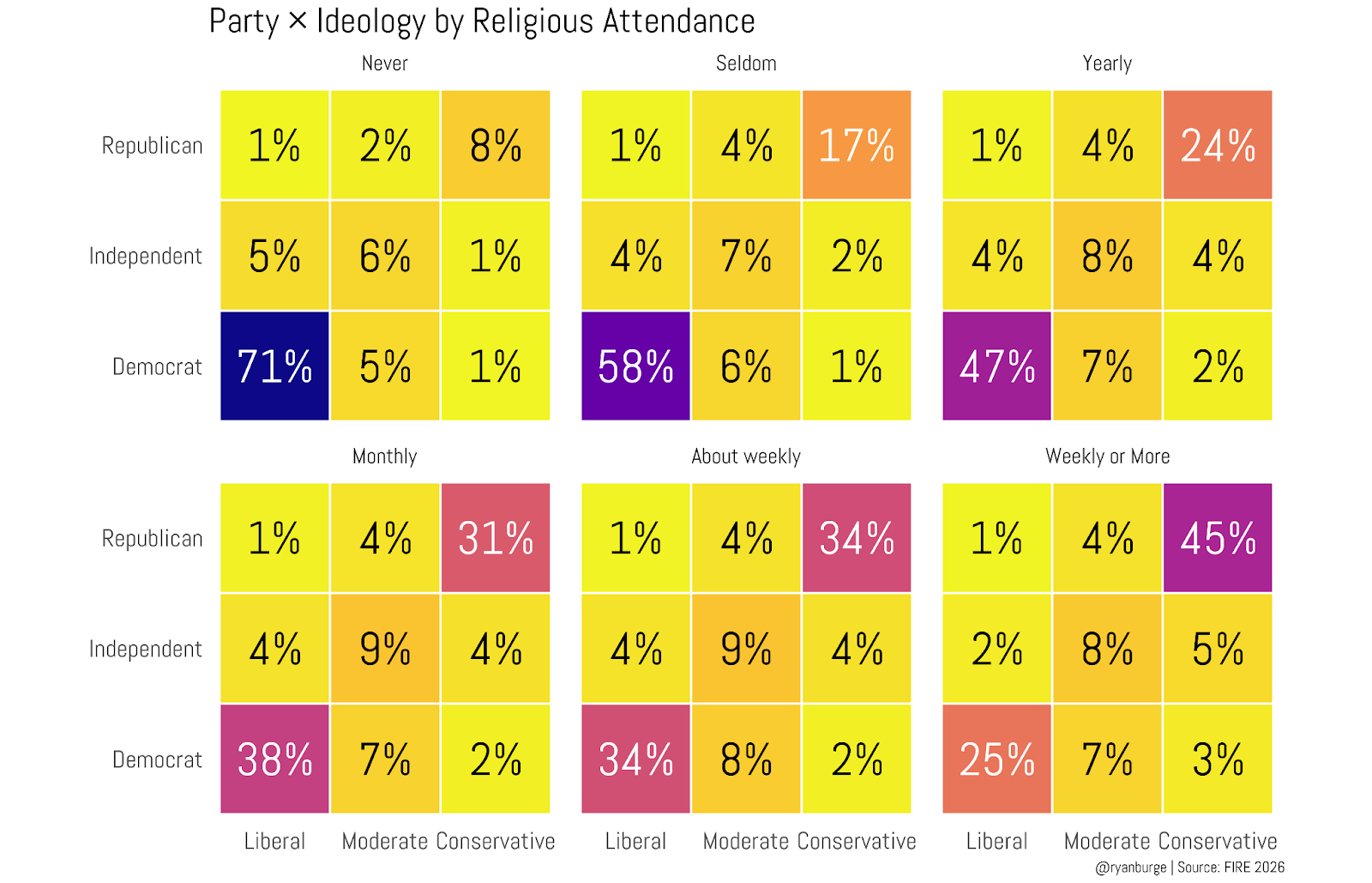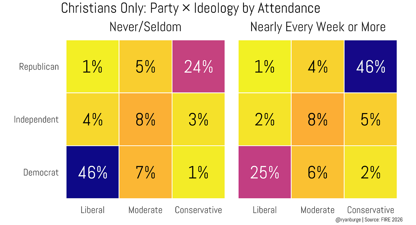 And these graphs are basically the opposite of each other, right? Among the never/seldom-attending Christians, 46% are liberal Democrats and 24% are conservative Republicans. For those who go to church on a weekly basis, 46% are conservative Republicans and 25% are liberal Democrats. Do you see why the numbers above were so even? The heatmap on the left balances the heatmap on the right when you look at the numbers in the aggregate.