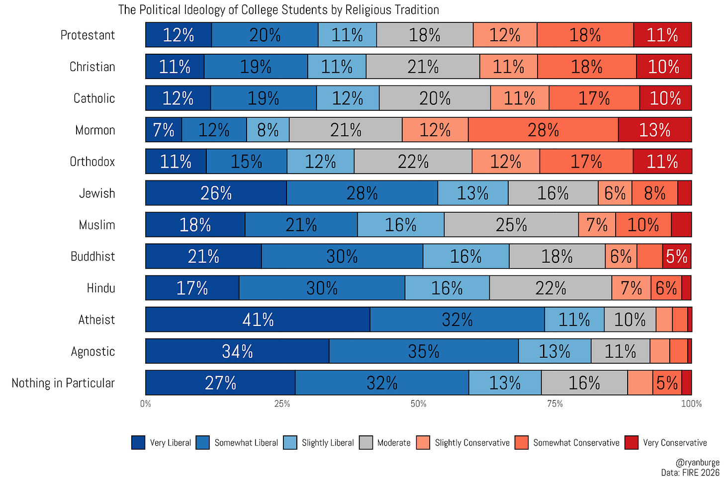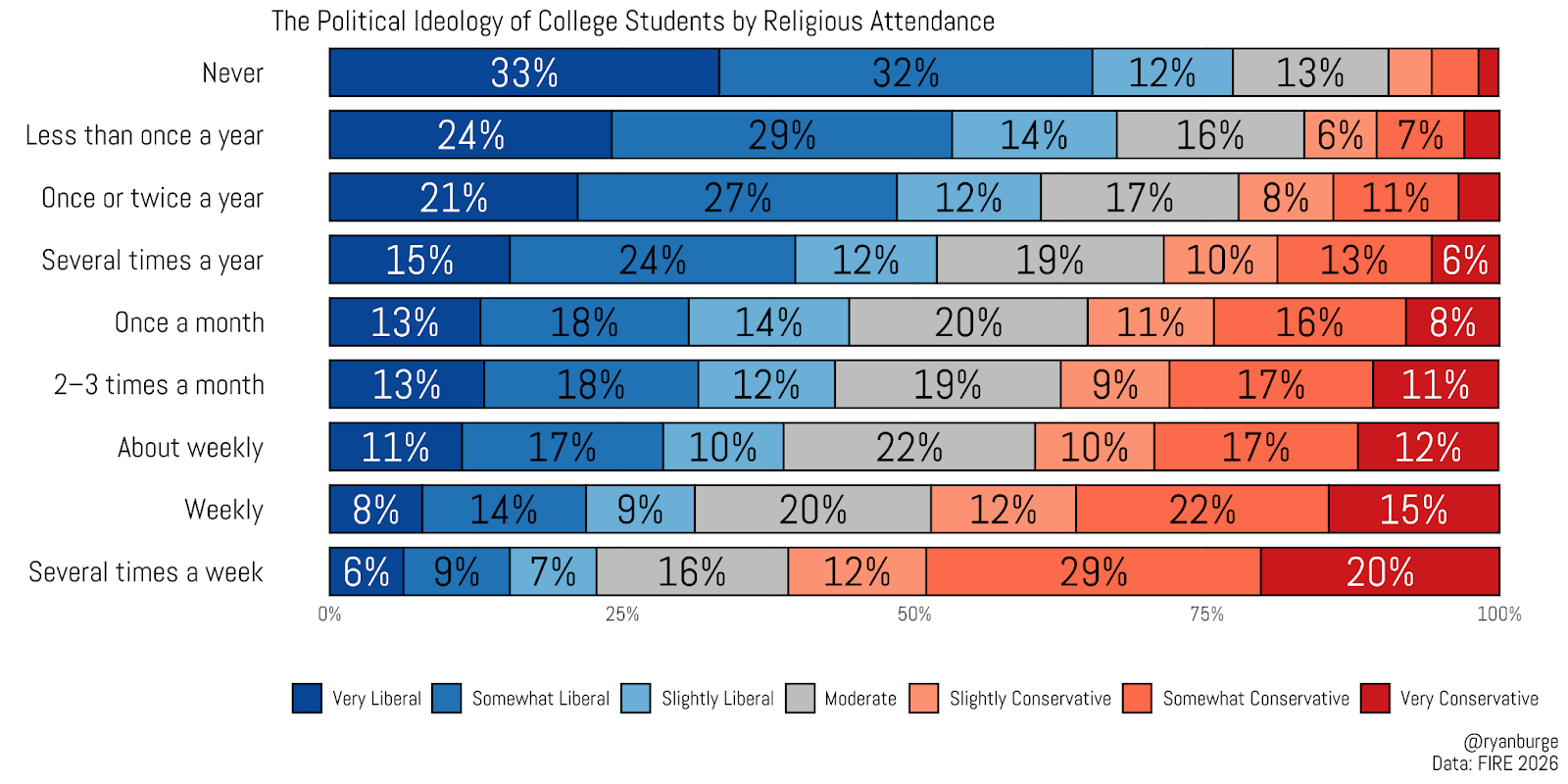 And, boy, that is a beautiful cascade of stacked bars. Among college students who report that they never attend religious services, 33% report that they are “very liberal,” and nearly the same share (32%) indicate that they are “somewhat liberal.” If you throw in the “slightly liberal” portion, you get two-thirds of never attenders on the liberal side of the spectrum. In contrast, conservatives make up 10% of the never attenders.