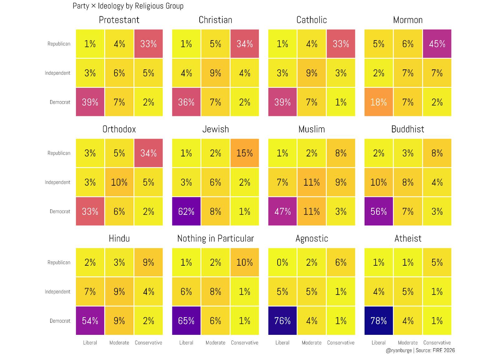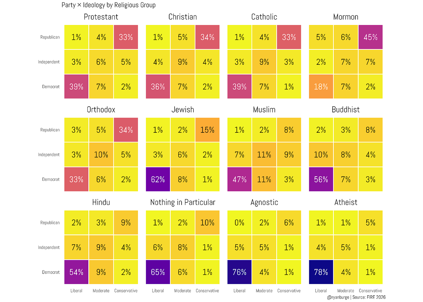 Let me visualize this in a couple of heatmaps, too. I collapsed the seven-point scales into three-point scales on both partisanship and ideology and calculated the distribution of the twelve religious groups across these nine squares.