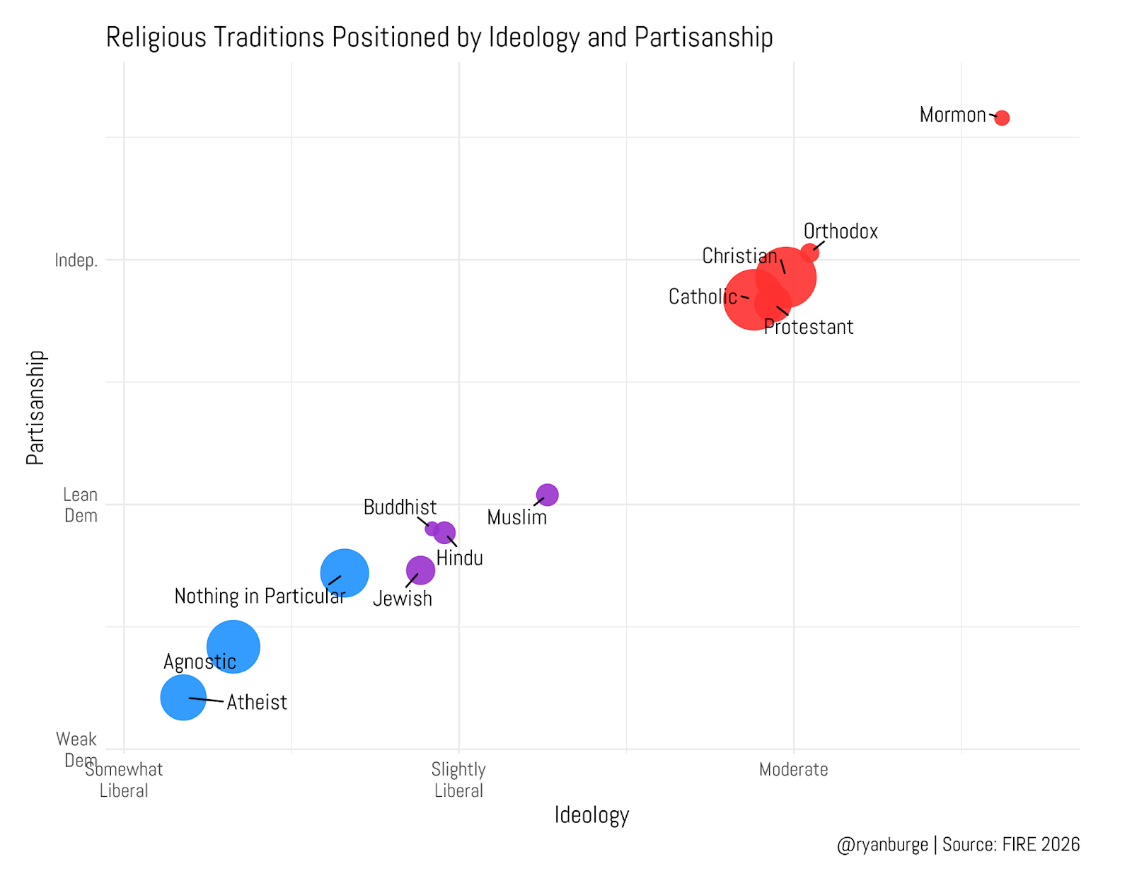 Let me add another dimension to this analysis by throwing in political partisanship, too. I am mapping the mean score for each tradition on two axes — ideology is on the horizontal axis, and partisanship is on the vertical. The size of the points indicates the sample size.