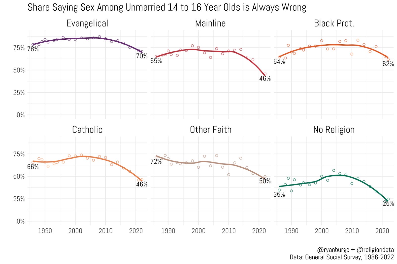 Evangelical sexual ethics has shifted very little over the last 35 years. In 1986, 78% of evangelicals thought that two teenagers having sex was always wrong. In the 2022 data that was down to 70%. A decline, for certain, but it’s relatively small. The only group in this analysis who has shifted less are Black Protestants - it was 64% in 1986 and 62% today. For the other two Christian groups, the shifts have been much larger.